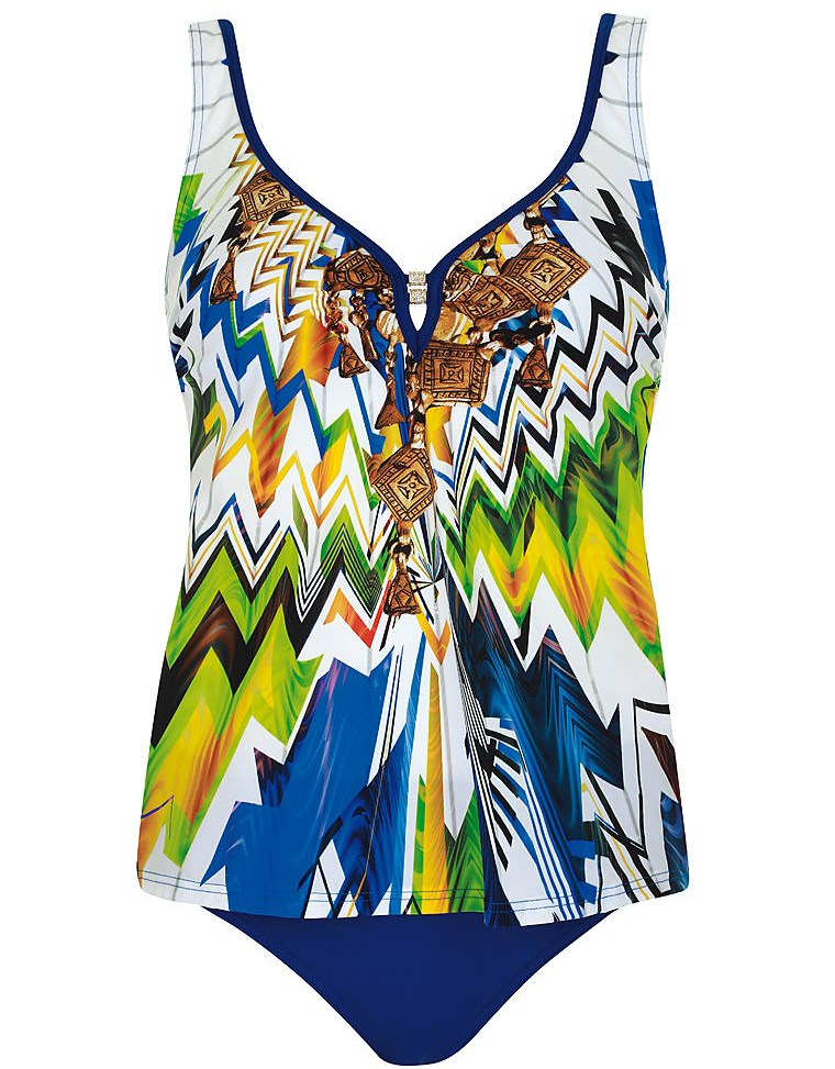 Sunflair Tankini, canotta scollo a V con charm glitterate, bretelle regolabili con cursore, coppe morbide con sostegno elasticizzato. Slip modello midi alto confortevole unica tinta, 78% poliammide, 22% elastano. Utilizzo di ecofibra riciclabile.