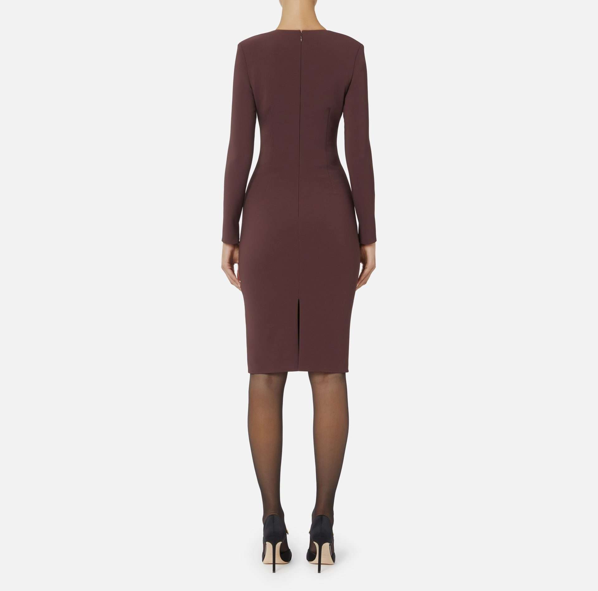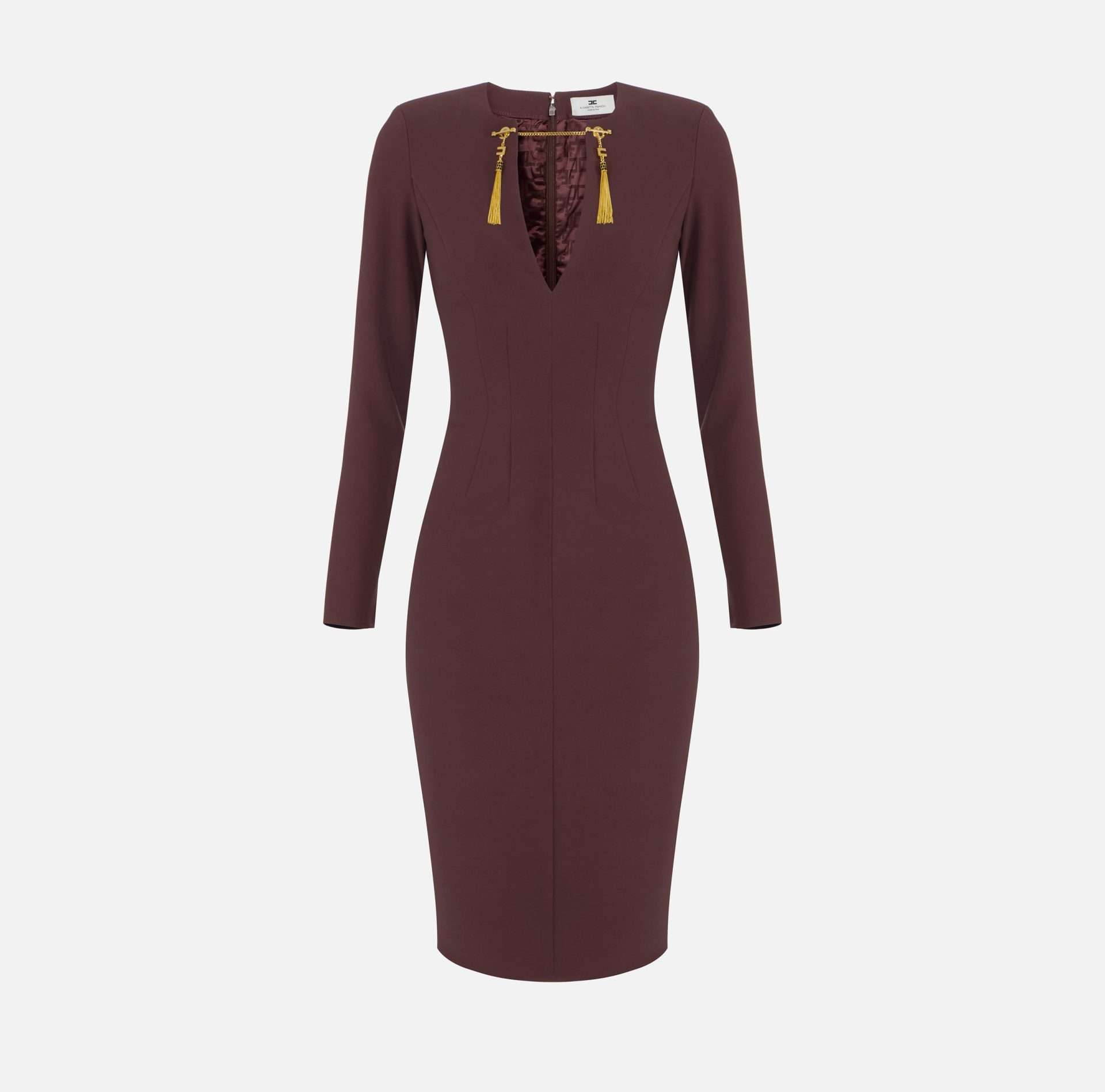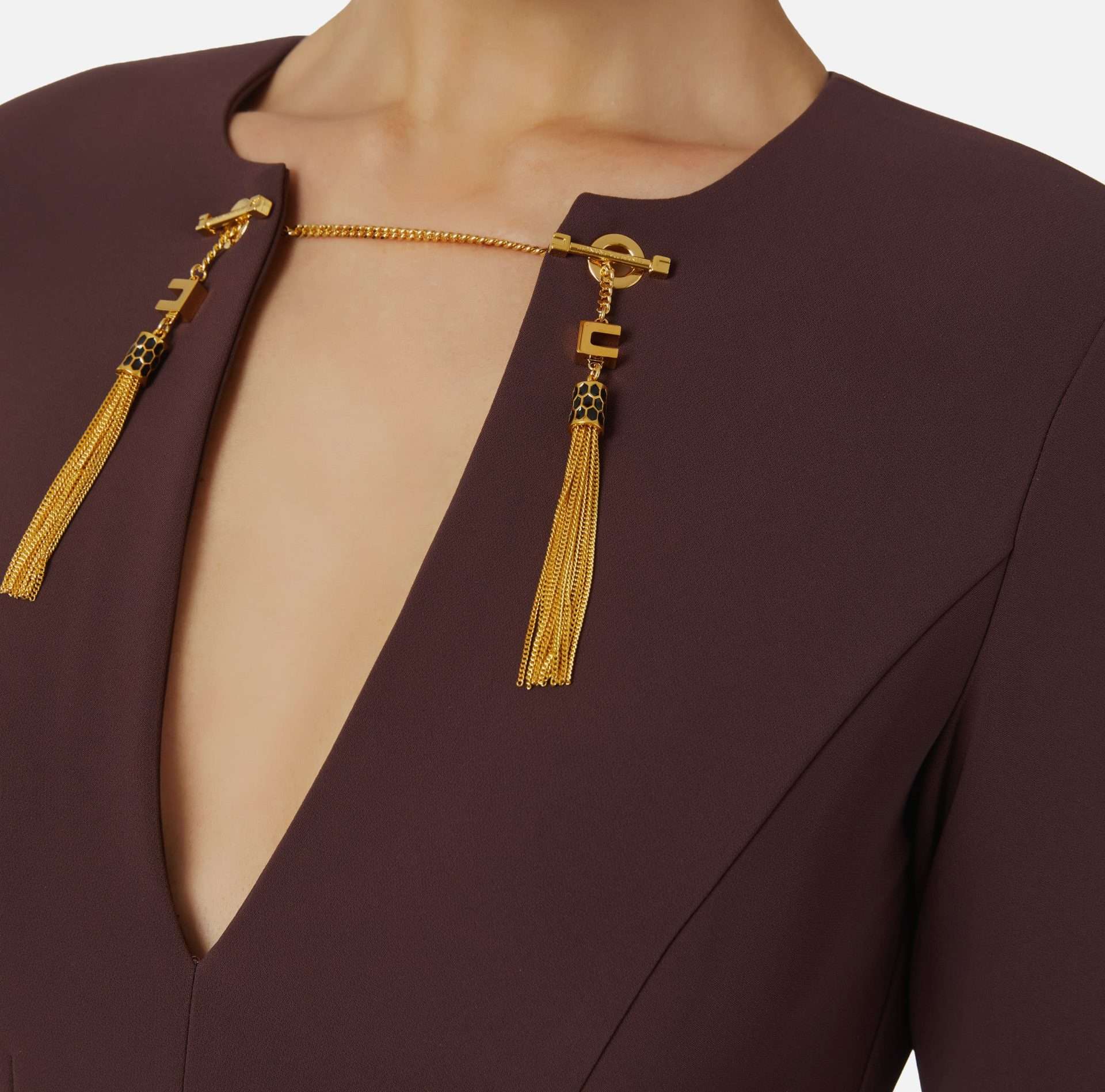 Abito in crêpe leggero dalla vestibilità slim. Il vestito ha spalle strutturate e girocollo con scollo a V impreziosito dai gemelli in catena con nappine in trama snake, amovibili per sperimentare più opzioni di styling. La cintura con logo sottolinea il punto vita. Spacco sul retro per una silhouette audace.