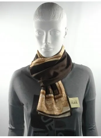 Foulard Alviero Martini 1° Classe in lana e seta misura cm 45×150 con fantasia geografica in rilievo sulla parte centrale di colore marrone e classica fantasia geografica di colore beige anche sui bordi. Composizione: 85% lana 15% seta Made in Italy.