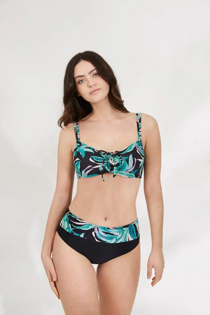 Bikini ferretto modellante coppa E Ysabel Mora motivo vegetazione selvatica su fondo nero.Reggiseno con stampa con ferretto e rinforzo laterale per un maggiore sostegno,lacci sulla parte centrale con possibilità di adattarlo meglio alla silhouette,bretelle regolabili a doppio filo,chiusura posteriore con fibbia. Slip a vita alta nero con riporto a fantasia sulla parte superiore sul davanti. Articolo rivestito internamente da morbido tulle nero che abbraccia la silhouette e la rende più attraente. Con questo capo sarete eleganti e seducenti anche in spiaggia.