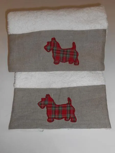 Coppia spugna Blanc Mariclò art. A12780 viso+ospite balzata in lino con applicazione cagnolino in tartan. Tessuto spugna. Composizione: 100% cotone. Marca: Blanc Mariclò.