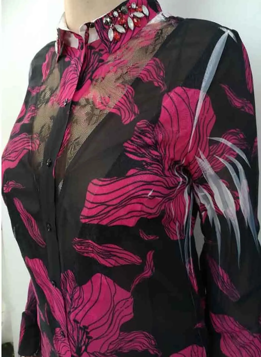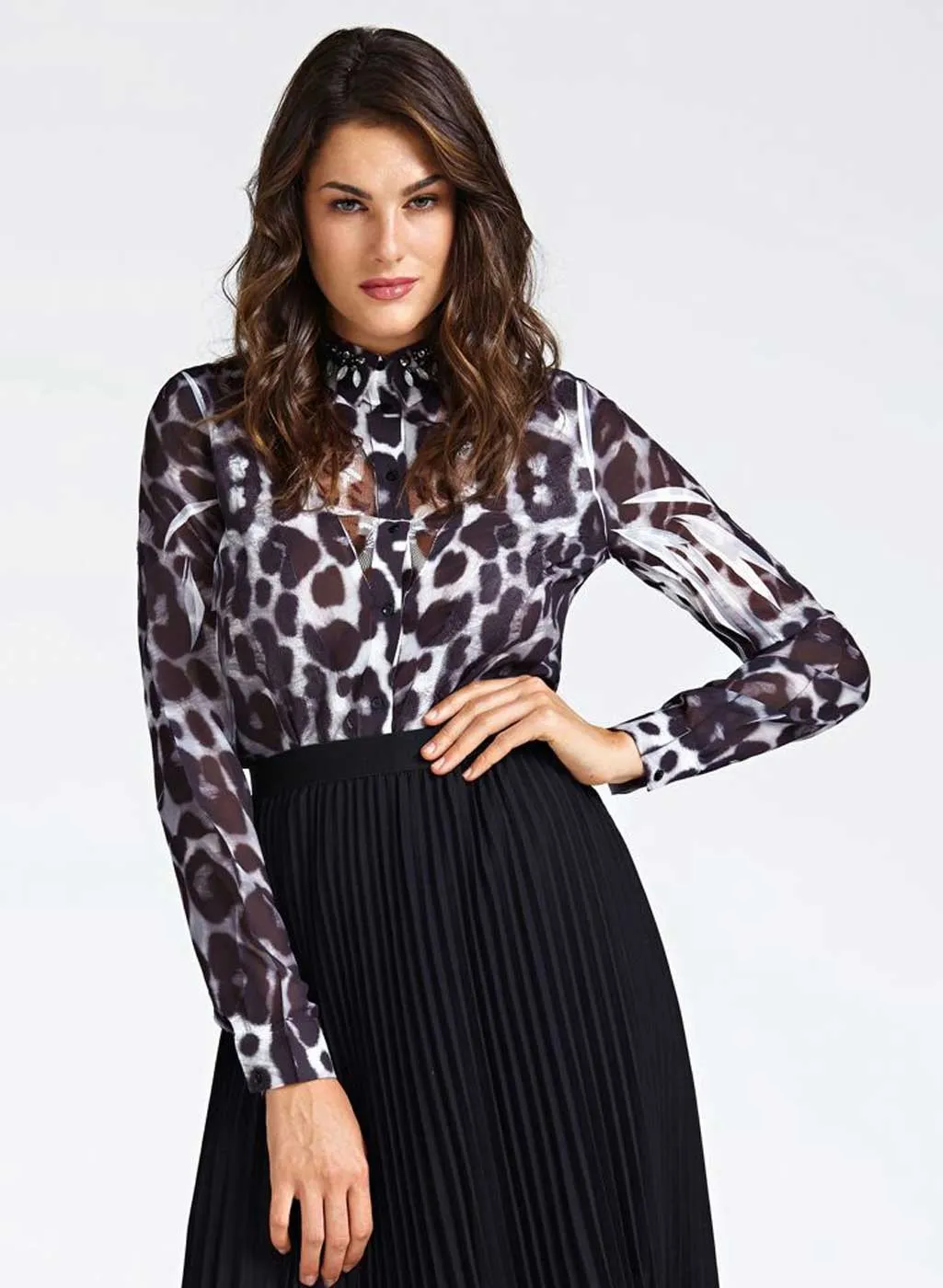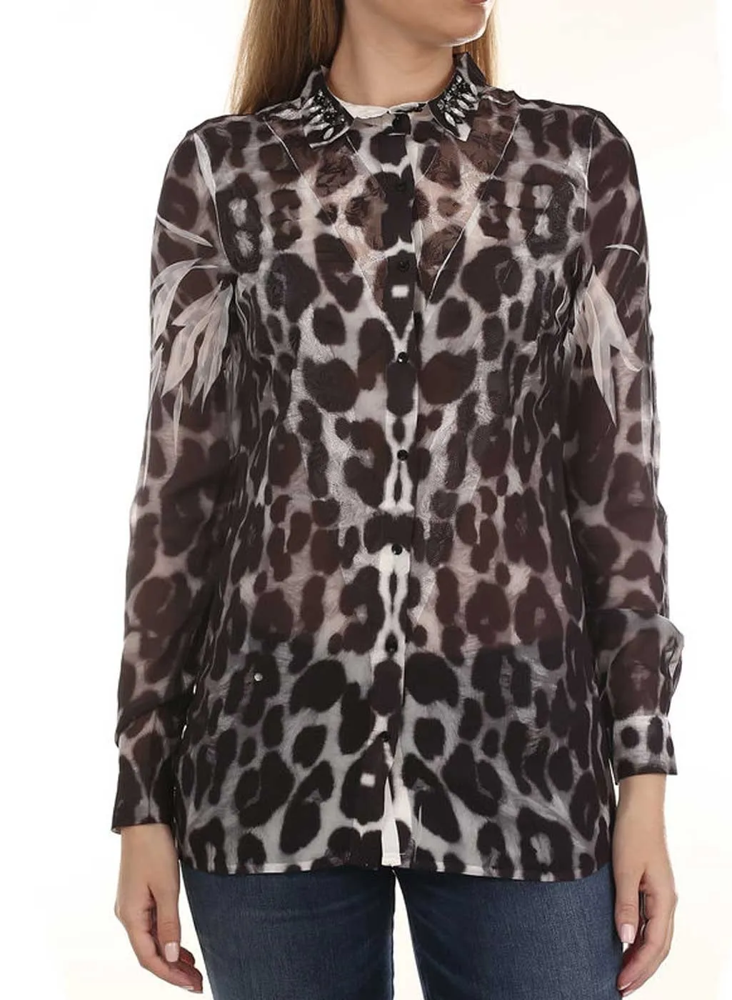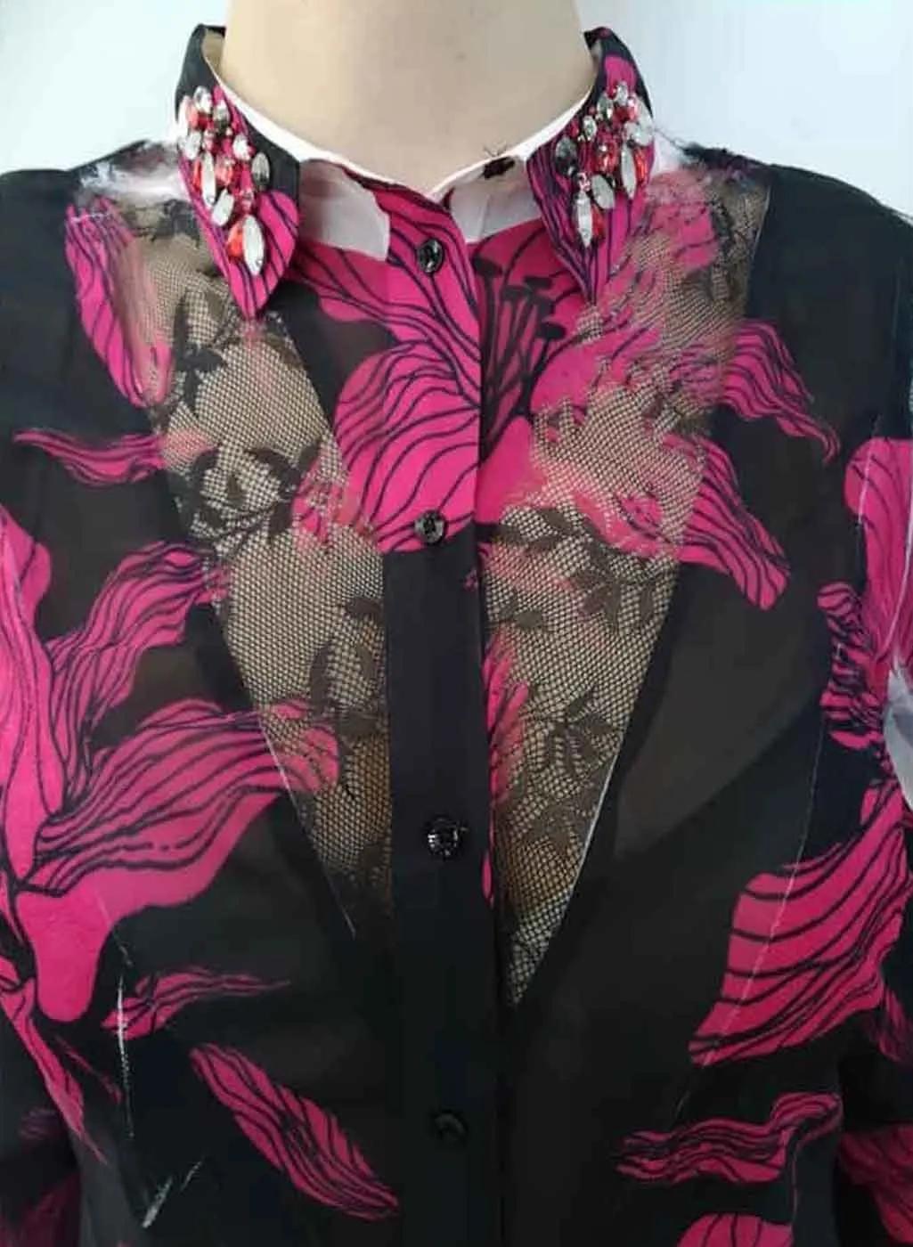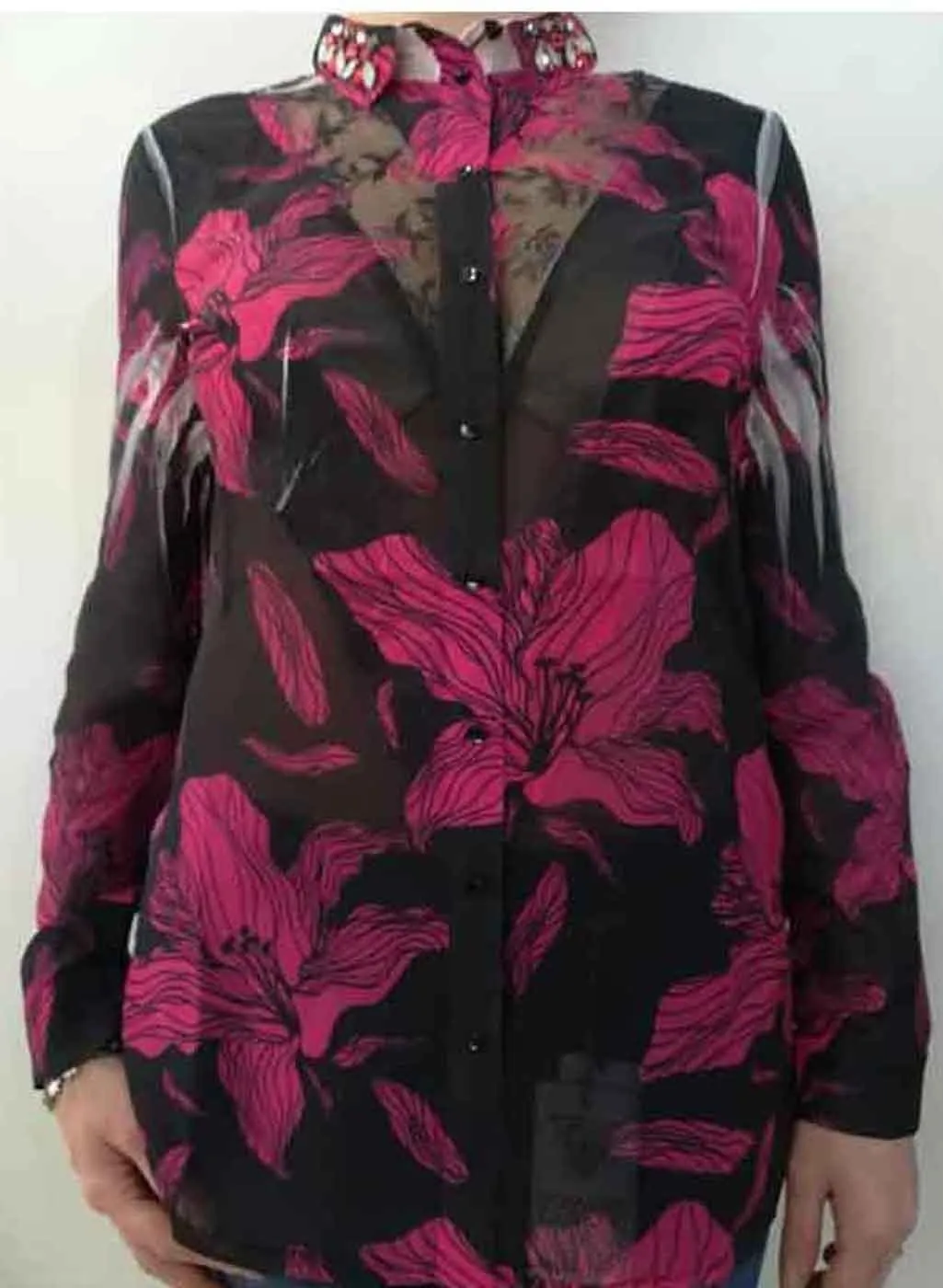 Blousa Donna Guess art. W93H72W70Q0. Particolare ed elegante in tessuto morbido velato con ricamo centrale e pietre preziose sul colletto. Chiusura con bottoncini e vestibilità morbida. N.B. Selezione Colori: Rosa con fondo nero e fiori fucsia; Bianco con fondo nero maculata in bianco/grigio. Composizione: 100% Poliestere. Marca: Guess.