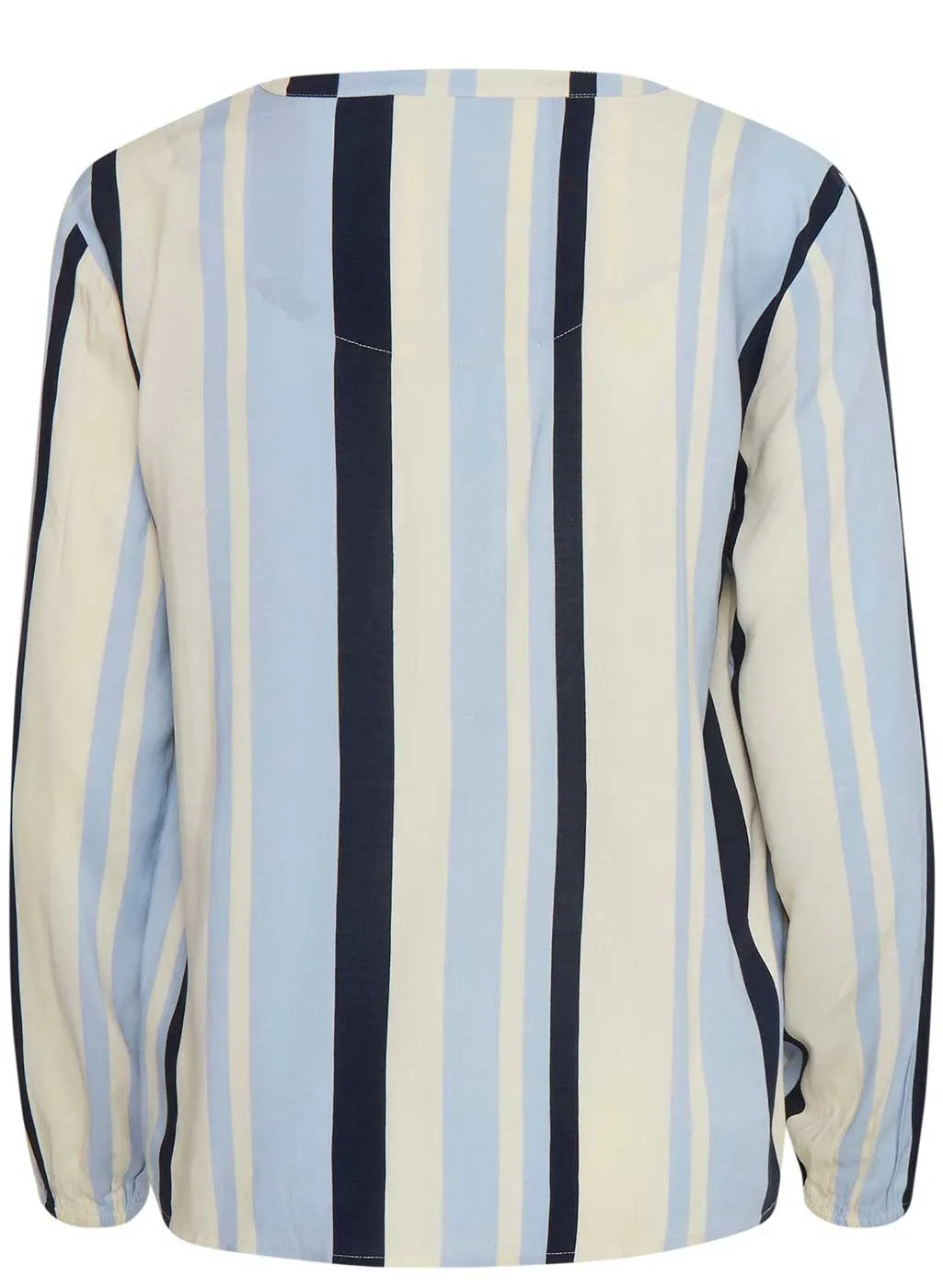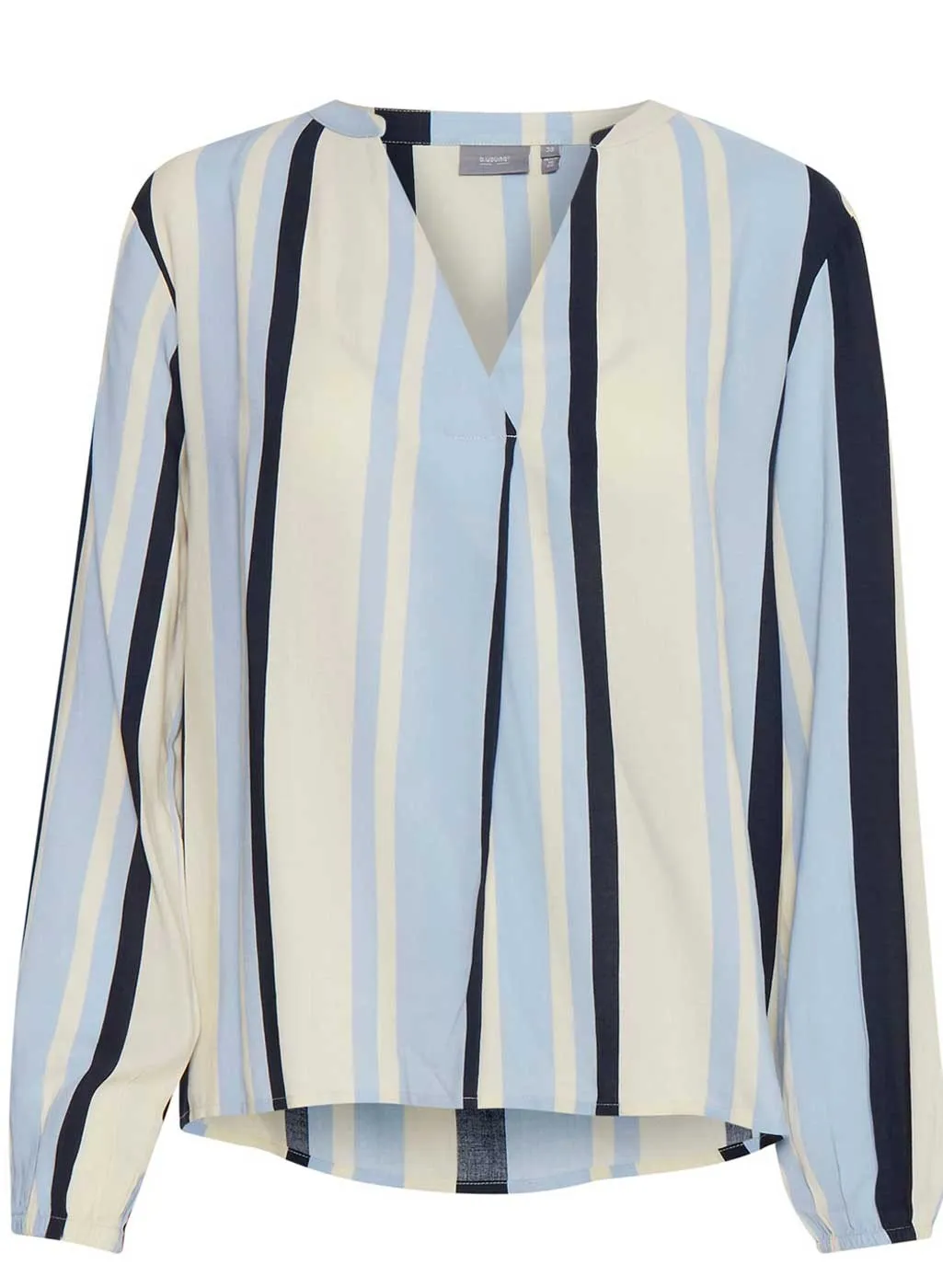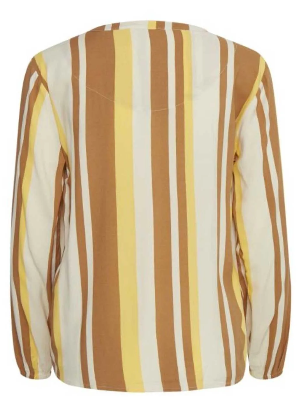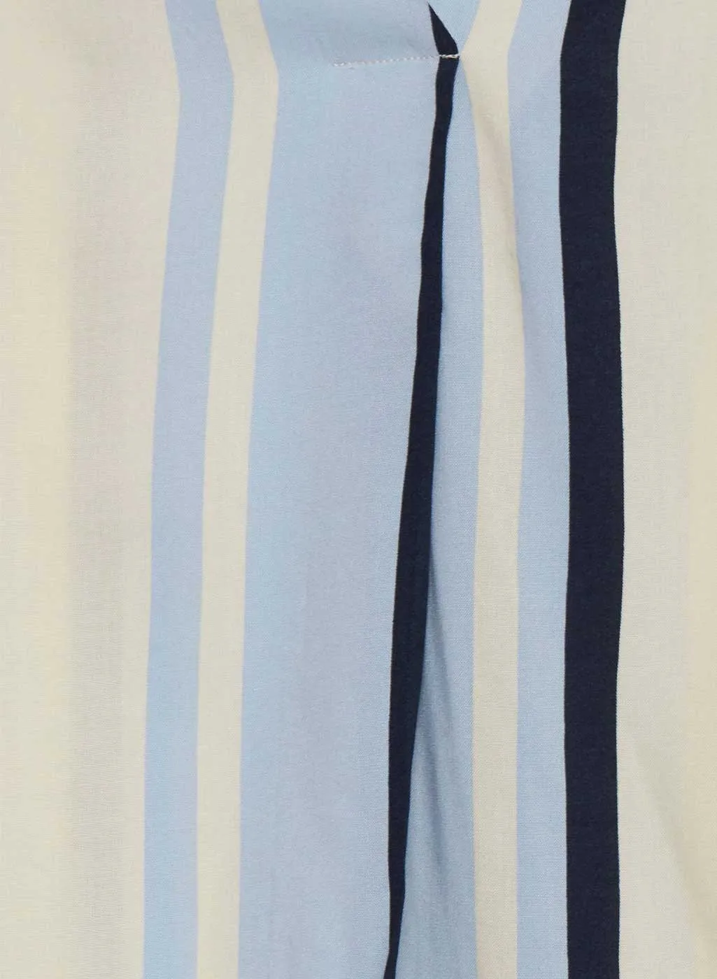 Blusa Donna B.Young art.20807462. Blusa con fantasia a righe e collo alla coreana con scollatura a V. Disponibile in due colori: blu (righe: celeste, blu e panna) e Beige (righe: giallo, cammello e panna). Questa elegante Blusa e’ idale da indossare con jeans o gonna, vestibilita’ comoda e tessuto 100% Viscosa. Comodi polsini con elastico. Marca: B.Young.
