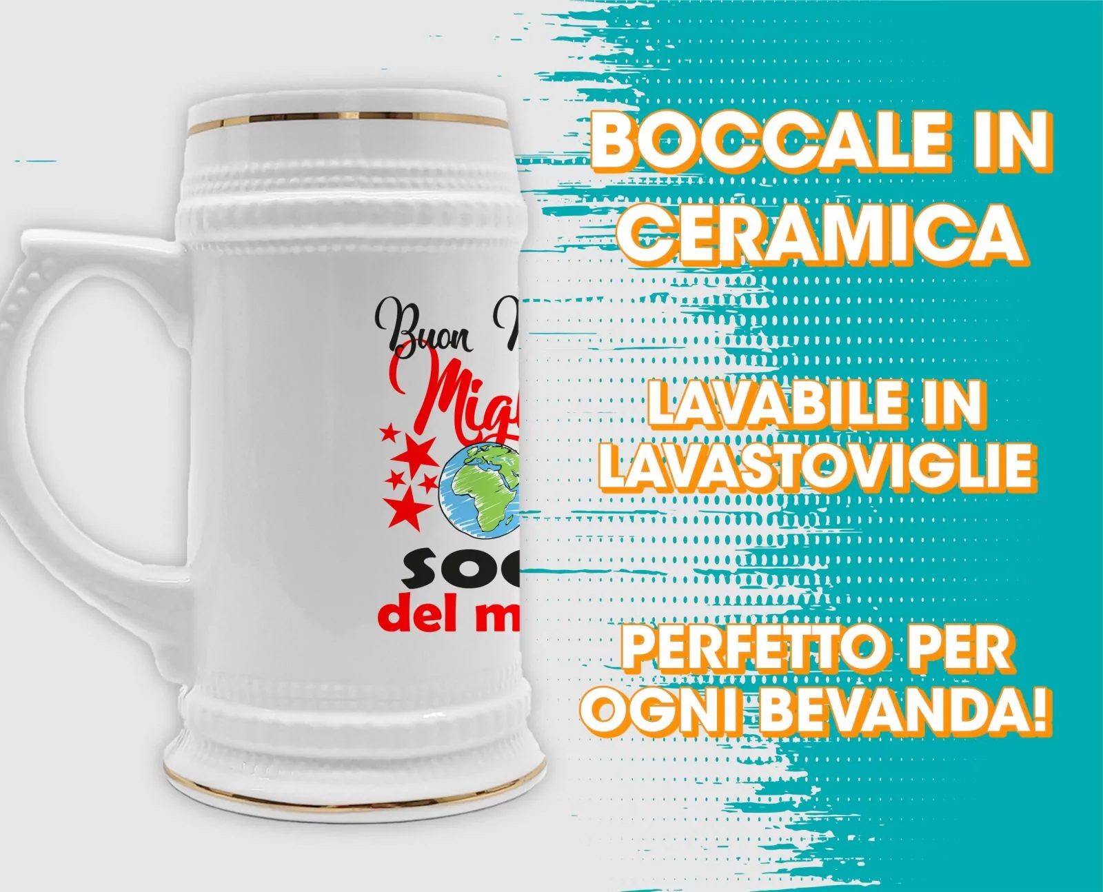 Boccale da Birra in ceramica realizzato in sublimazione , resistente ai lavaggi in lavastoviglie , con pratico manico che facilita la presa .