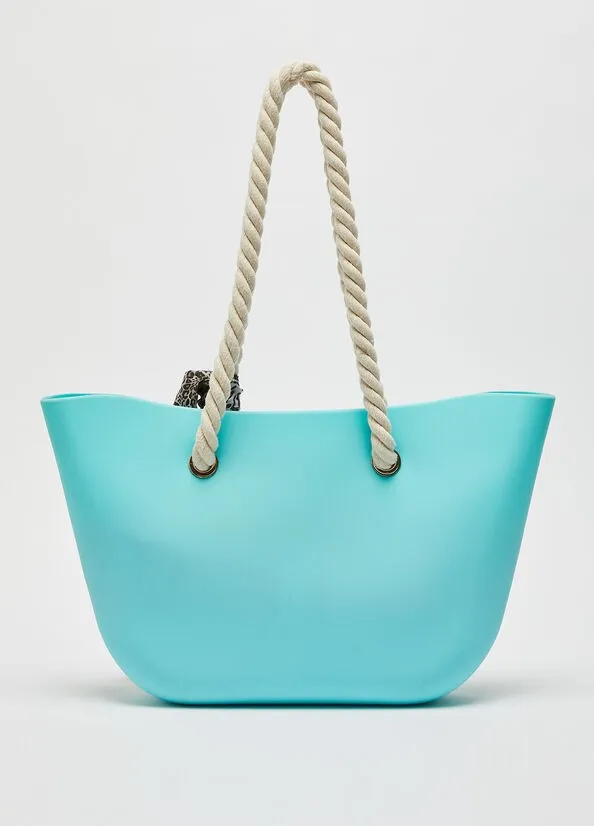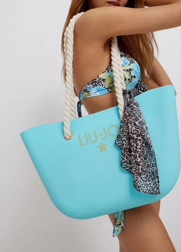 Borsa da mare in PVC con logo LJ stampato e con un decorativo nastro con stampa animalier, gli ampi manici in corda donano sostegno e un richiamo al tema mare. Borchie metalliche e logo in oro. Ampio scomparto centrale chiuso con zip. Praticità e comodità senza dimenticarsi di essere alla moda.