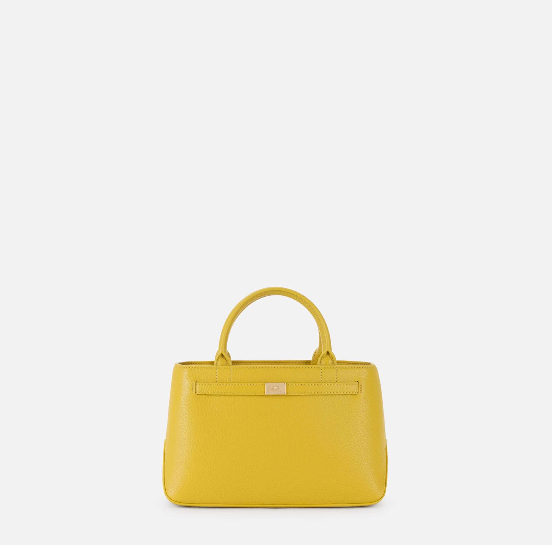 Borsa tote piccola, realizzata in materiale sintetico effetto pelle bottalata Ha manico e tracolla di servizio. Impreziosita sul cinturino dalla placca con logo in metallo dorato.