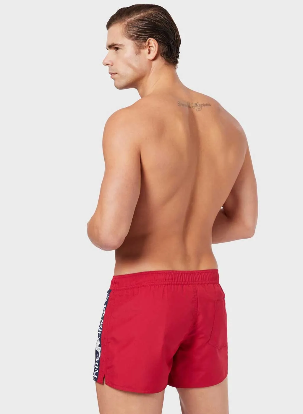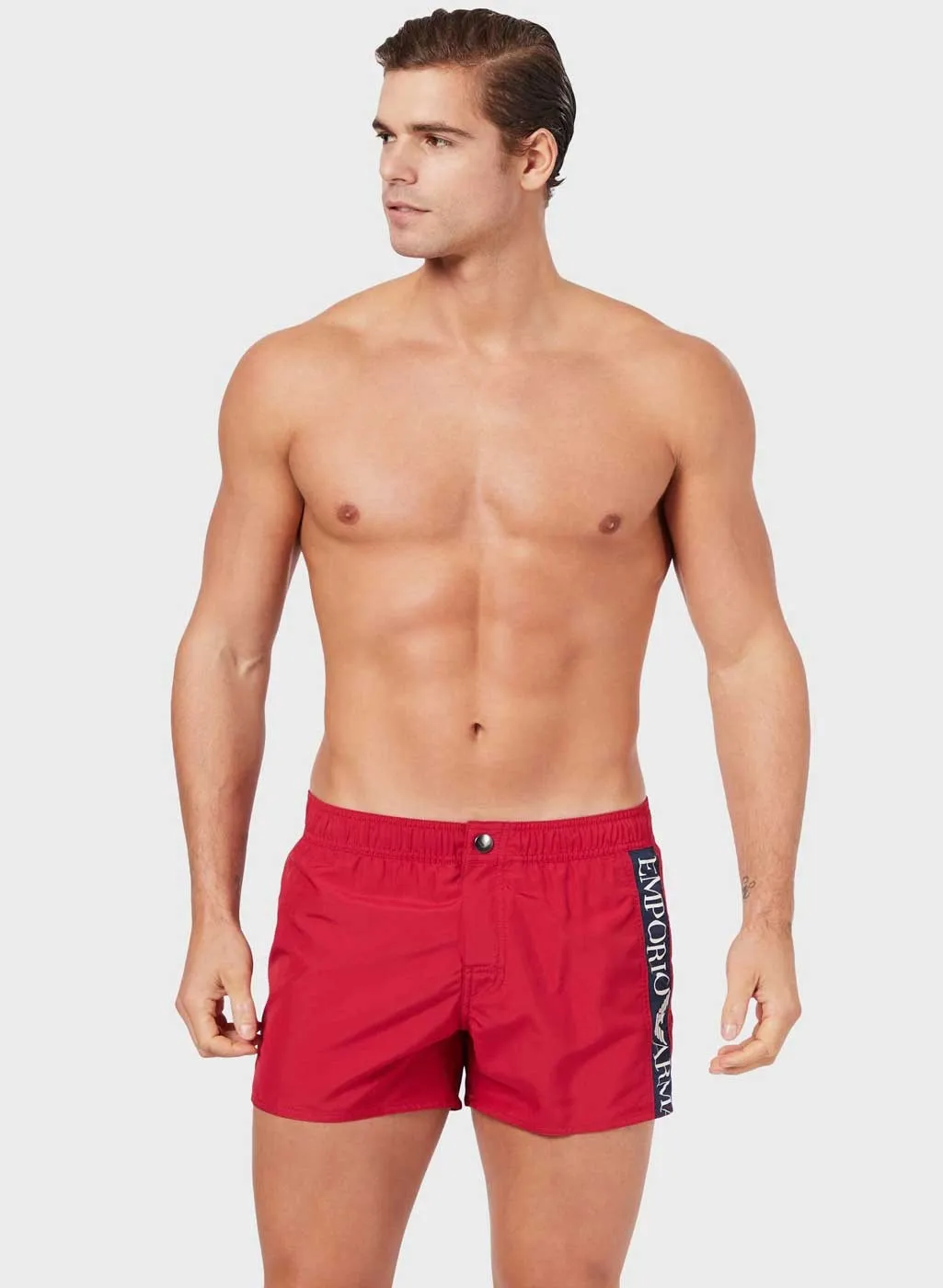 Boxer Art. 211742 0P425. Boxer Mare Uomo con striscia e scritta laterale a contrasto di colore. Elastico in vita e particolare chiusura con bottoncino e strappo,taschino sul retro e retina interna. Tessuto tecnico di facile asciugatura. Marca: Emporio Armani.