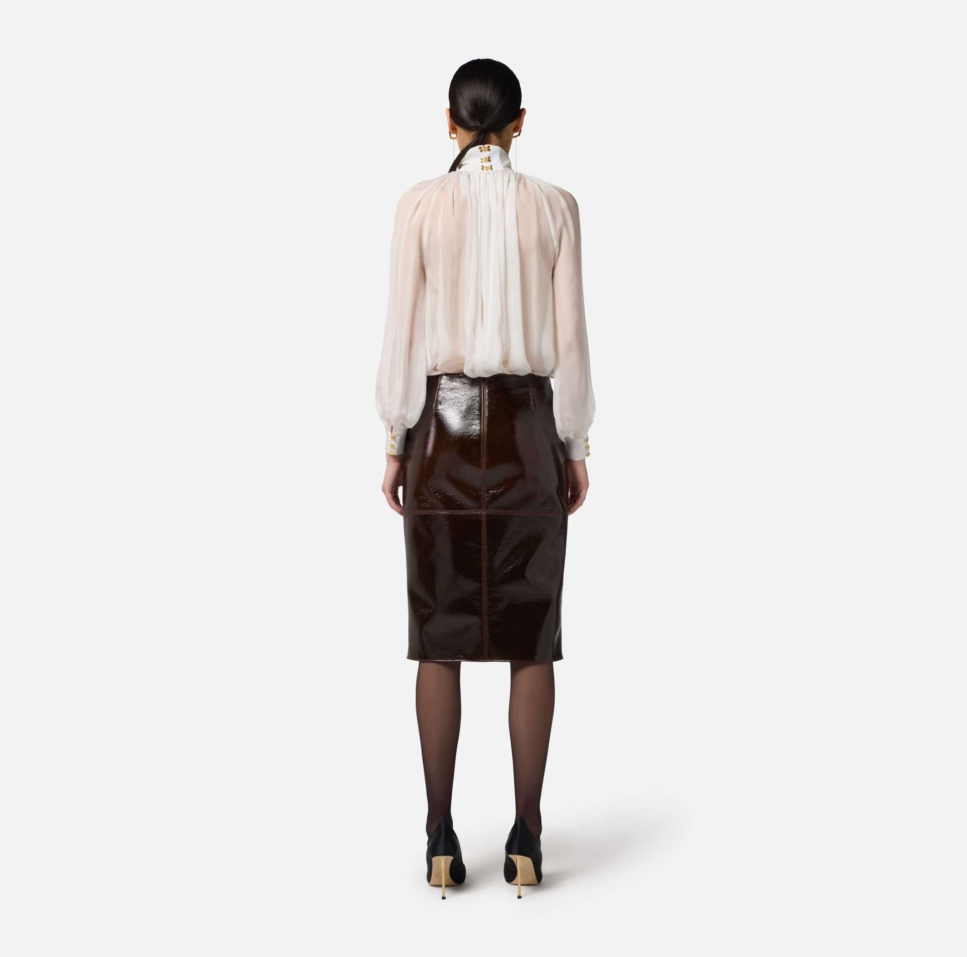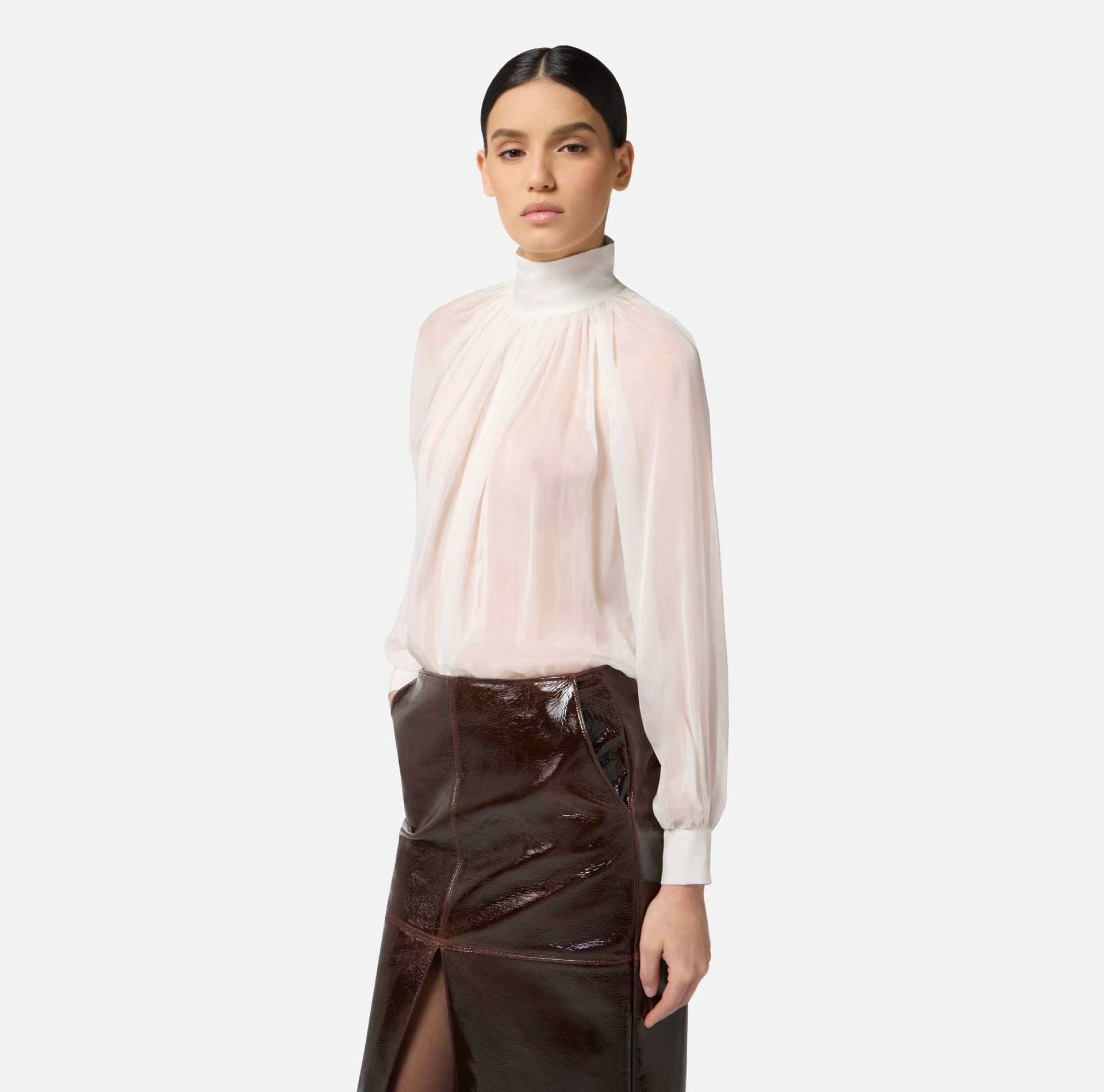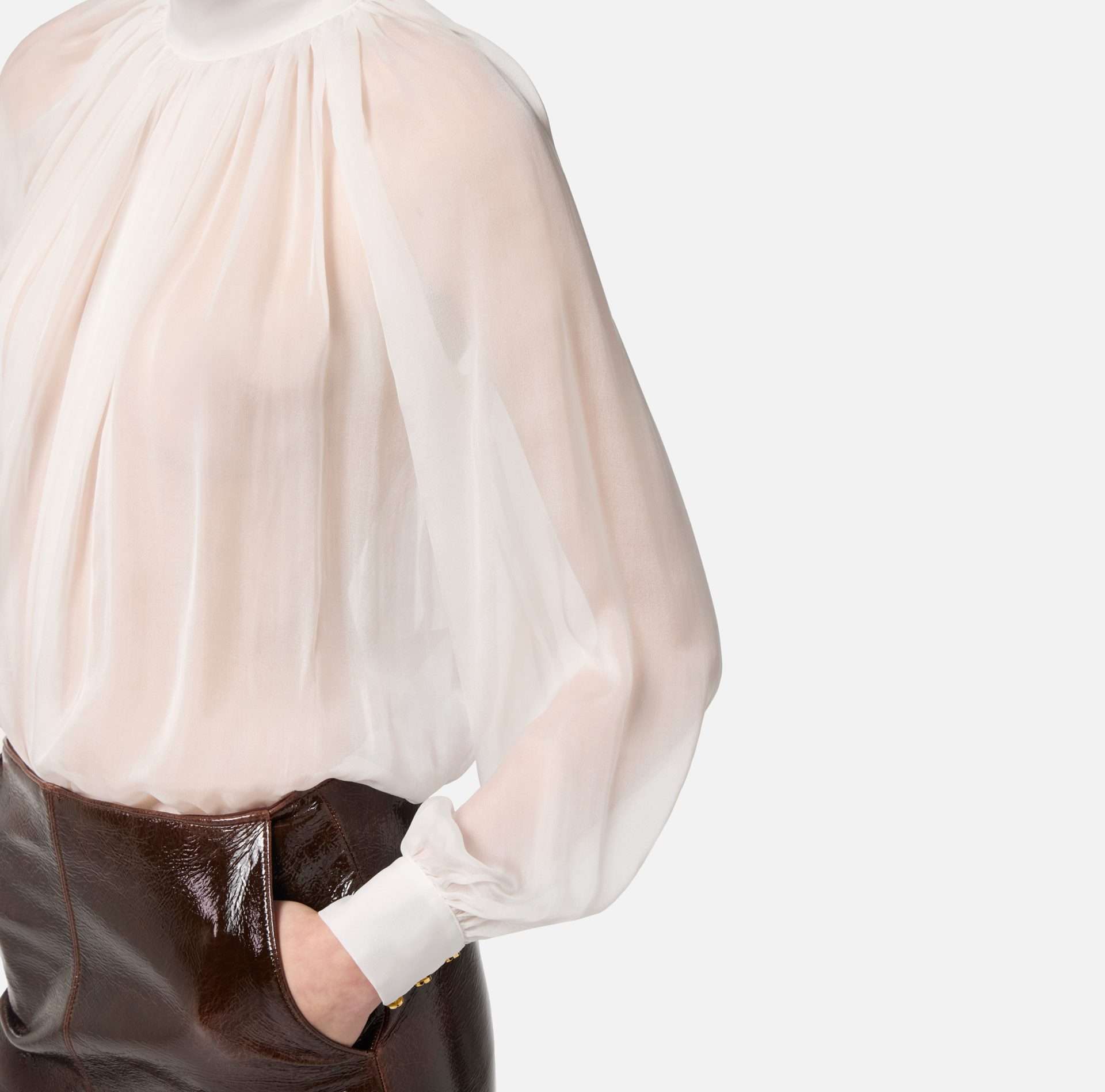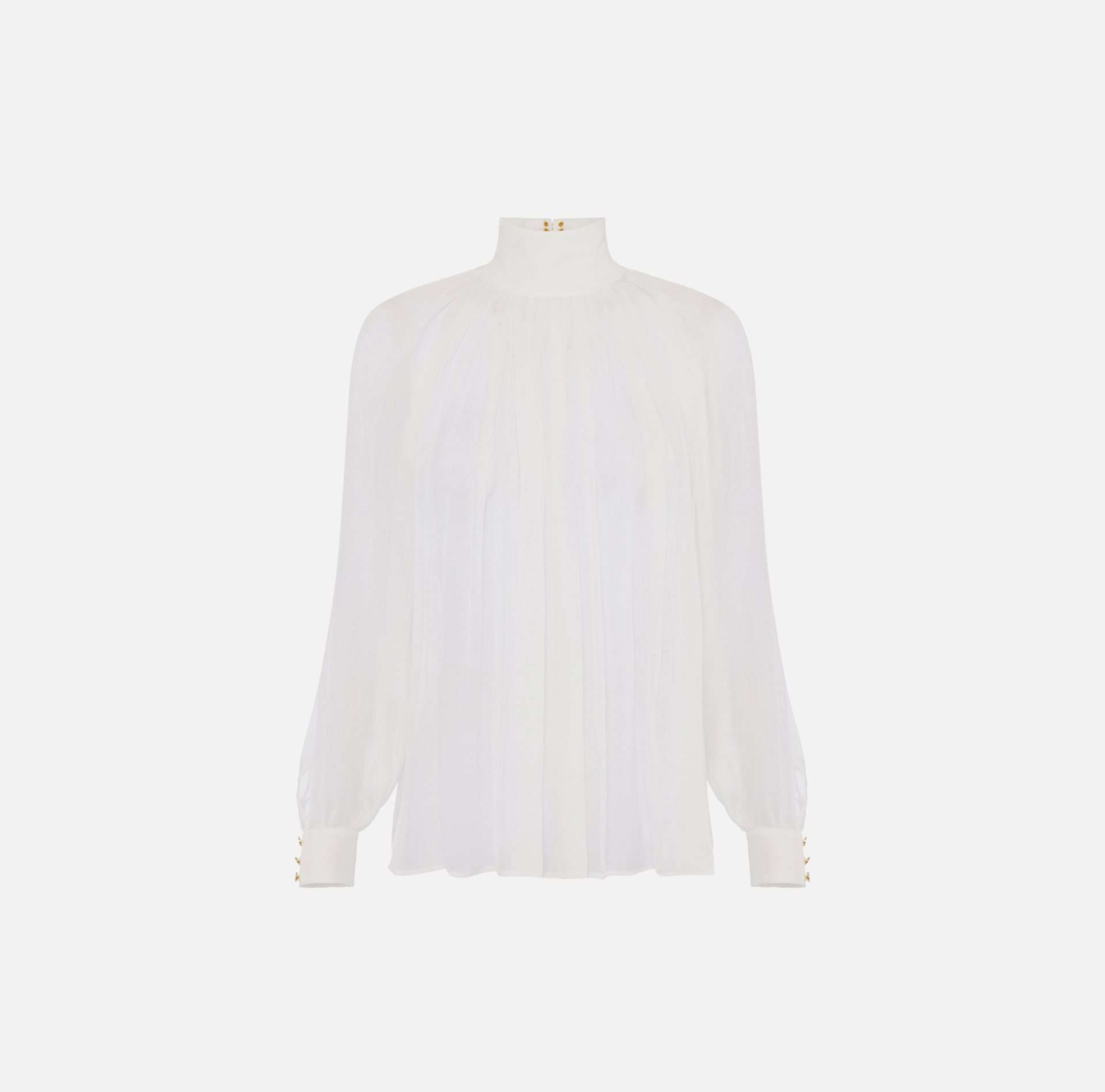 Blusa in voile dalla vestibilità slim. Ha collo alto con ganci in metallo dorato sul retro, maniche lunghe con polsi al fondo. La lavorazione a pieghe dona un raffinato movimento al capo.