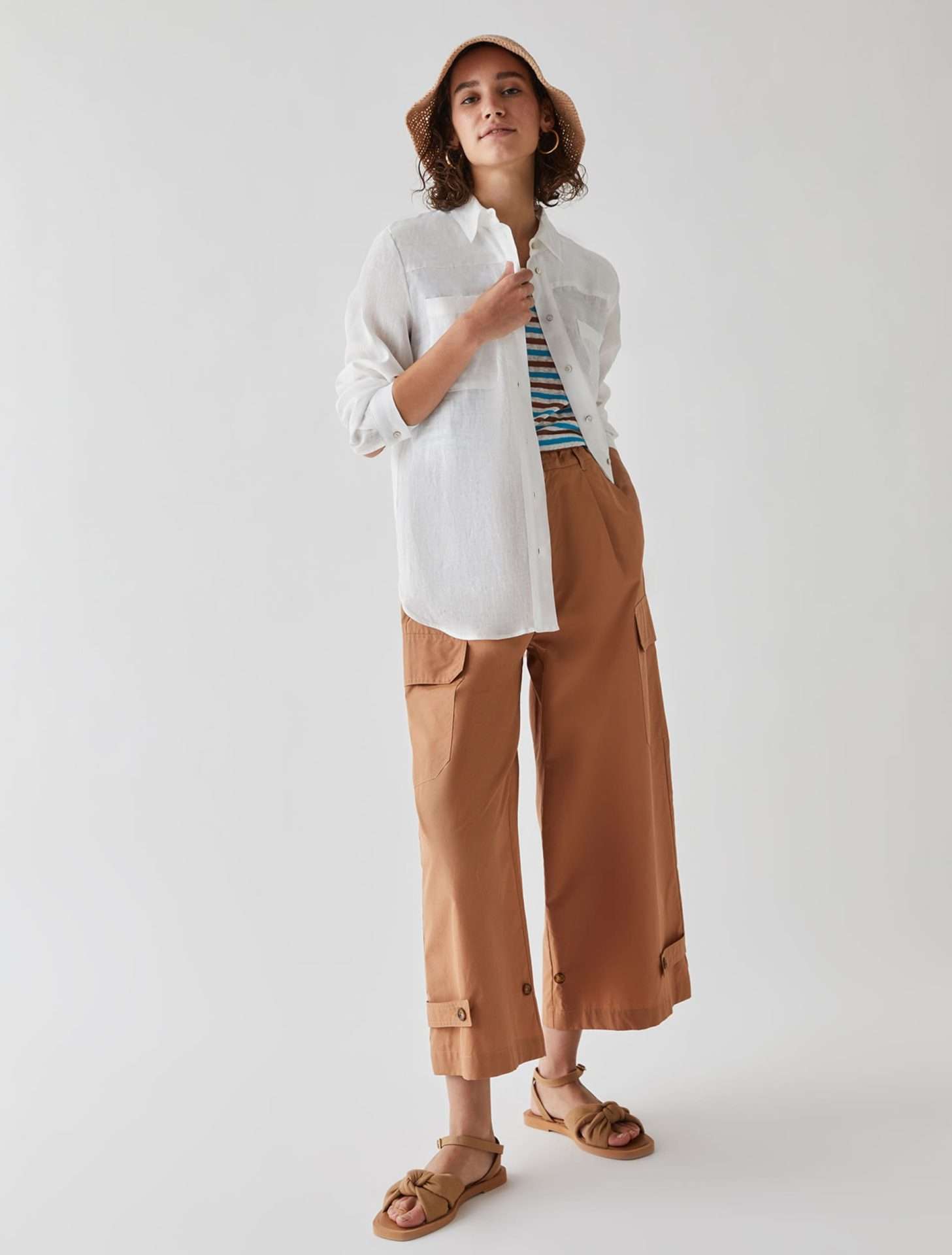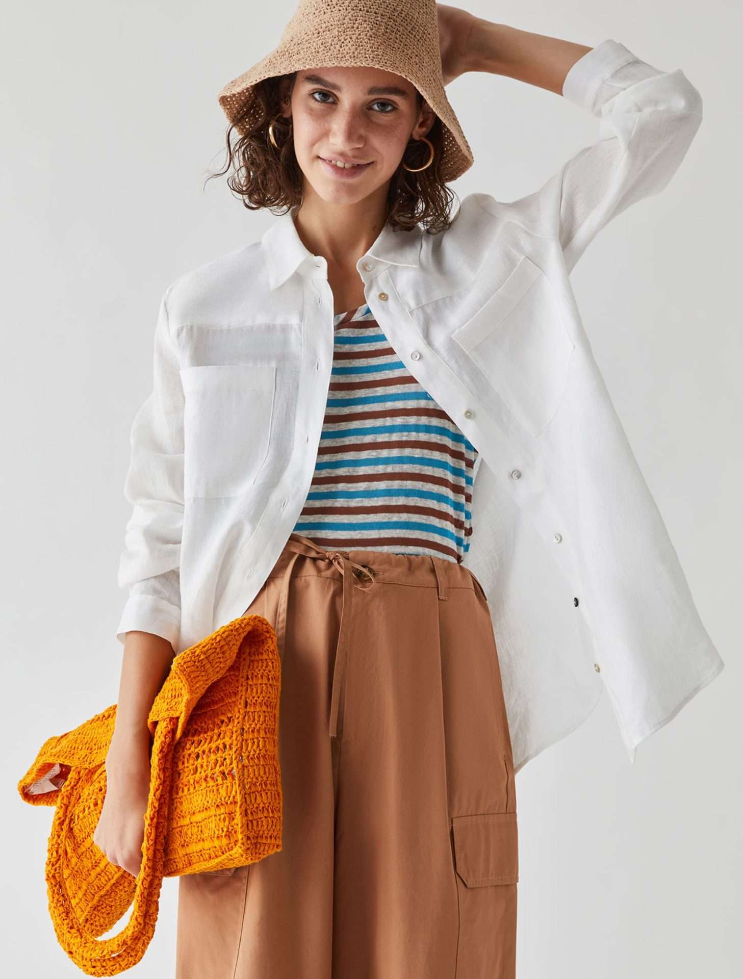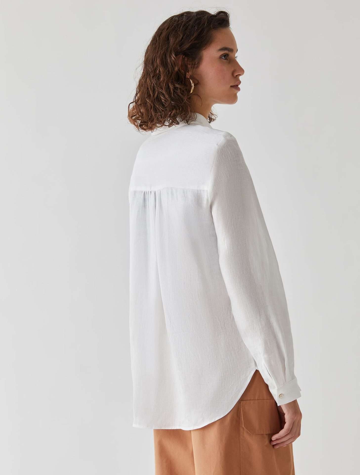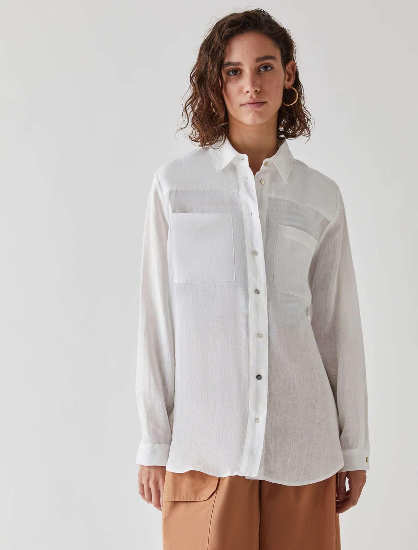 Camicia in puro lino dalla linea dritta, chiusa con bottoni. Colletto a camicia e maniche lunghe con polsini. Tasche applicate sul petto e fondo stondato. Leggera arricciatura sul retro.