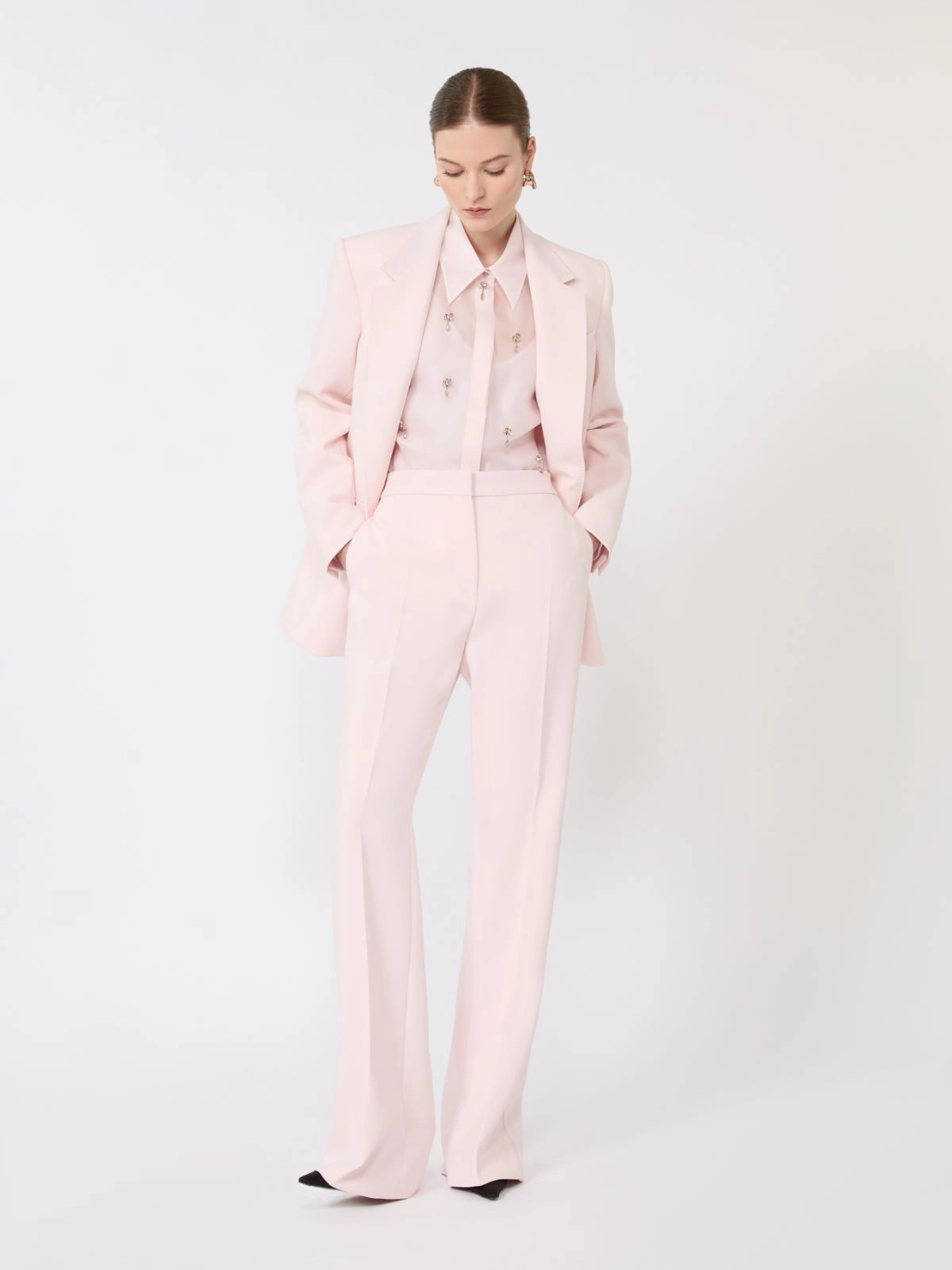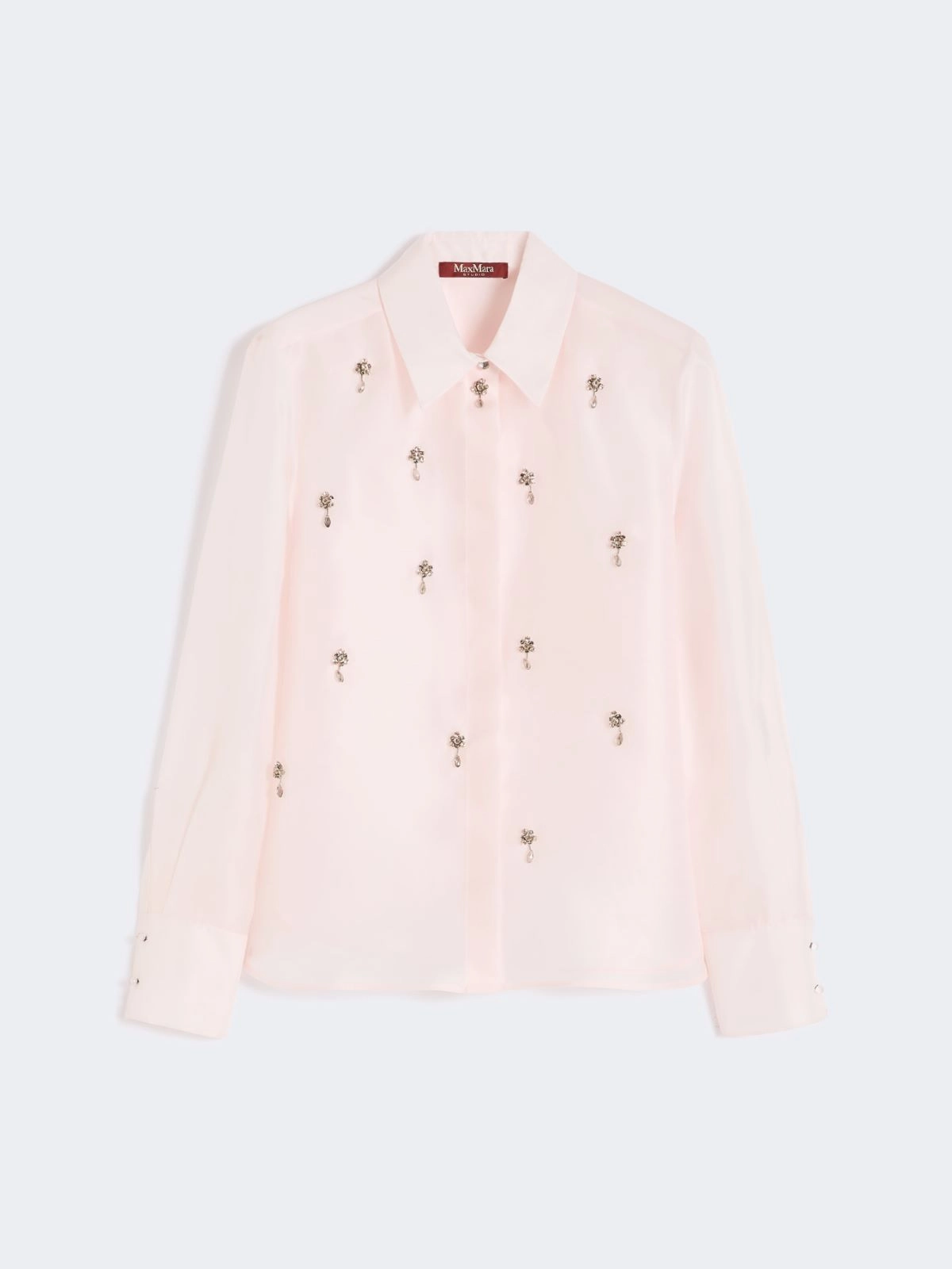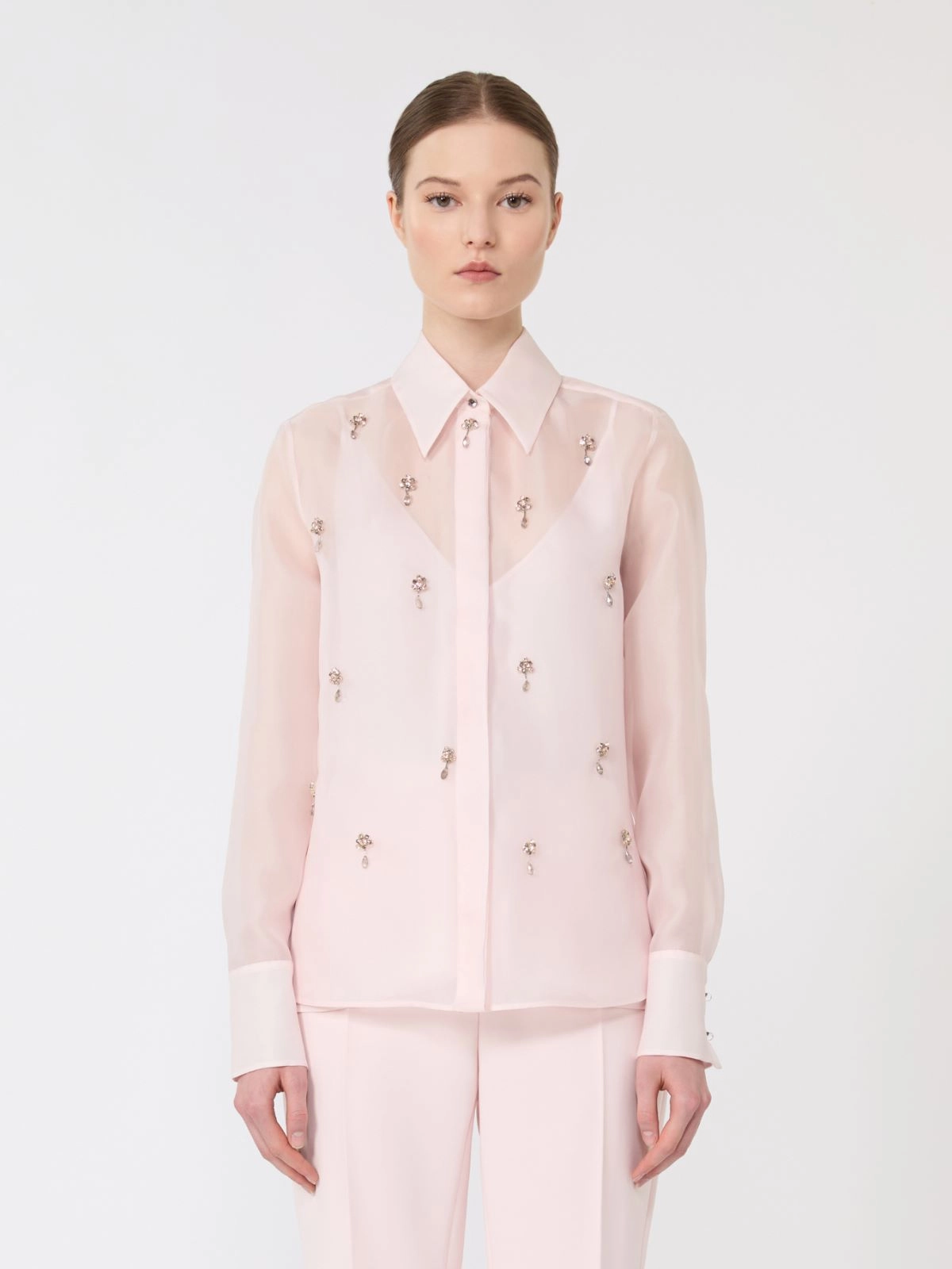 Camicia maschile impreziosita da dettagli ricamati sul davanti. Camicia in organza di pura seta. Linea dritta. Colletto e polsini alti con bottoni gioiello. Chiusura all’inglese con bottoni nascosti. Sottoveste abbinata con spalline sottili