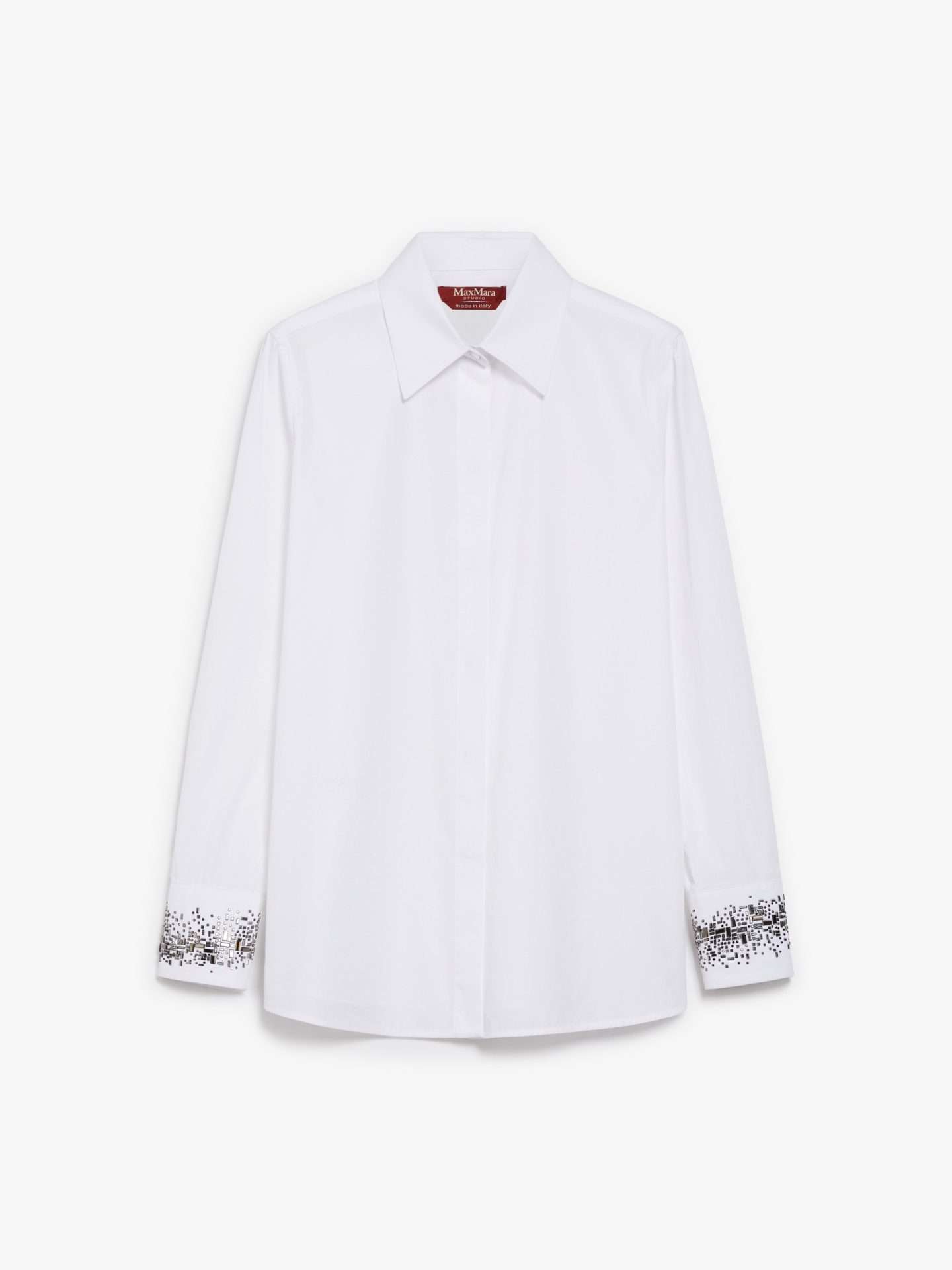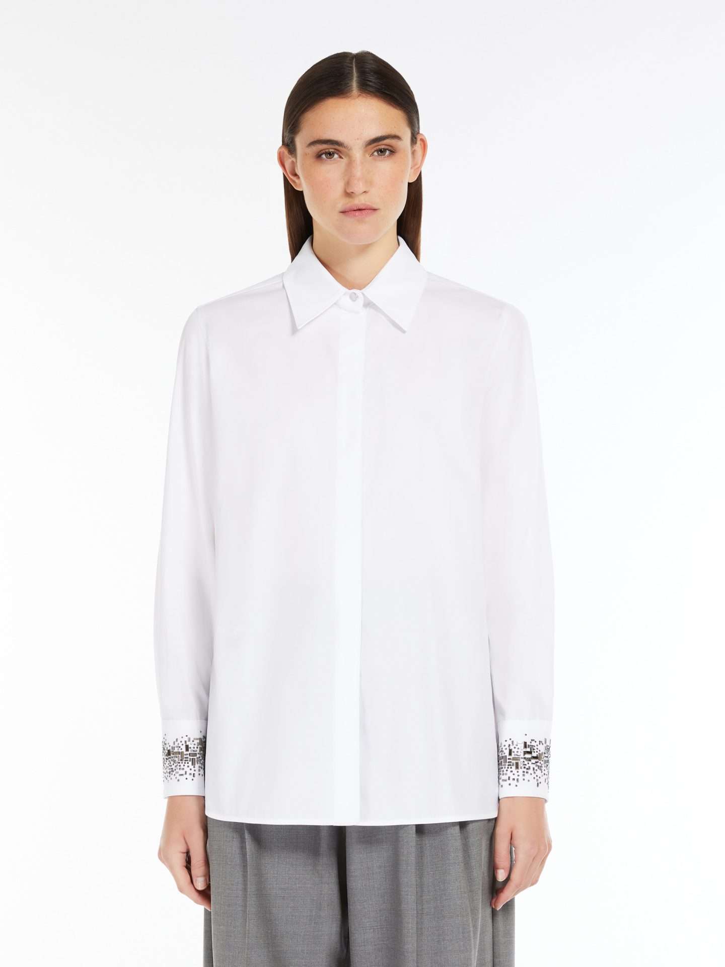 Camicia dal taglio classico, realizzata in popeline di puro cotone tinta unita, arricchita da un motivo di strass applicati sui polsini e chiusura con doppio bottone. Modello dalla linea dritta con spacchi laterali e fondo stondato. Chiusura con bottoni nascosti.