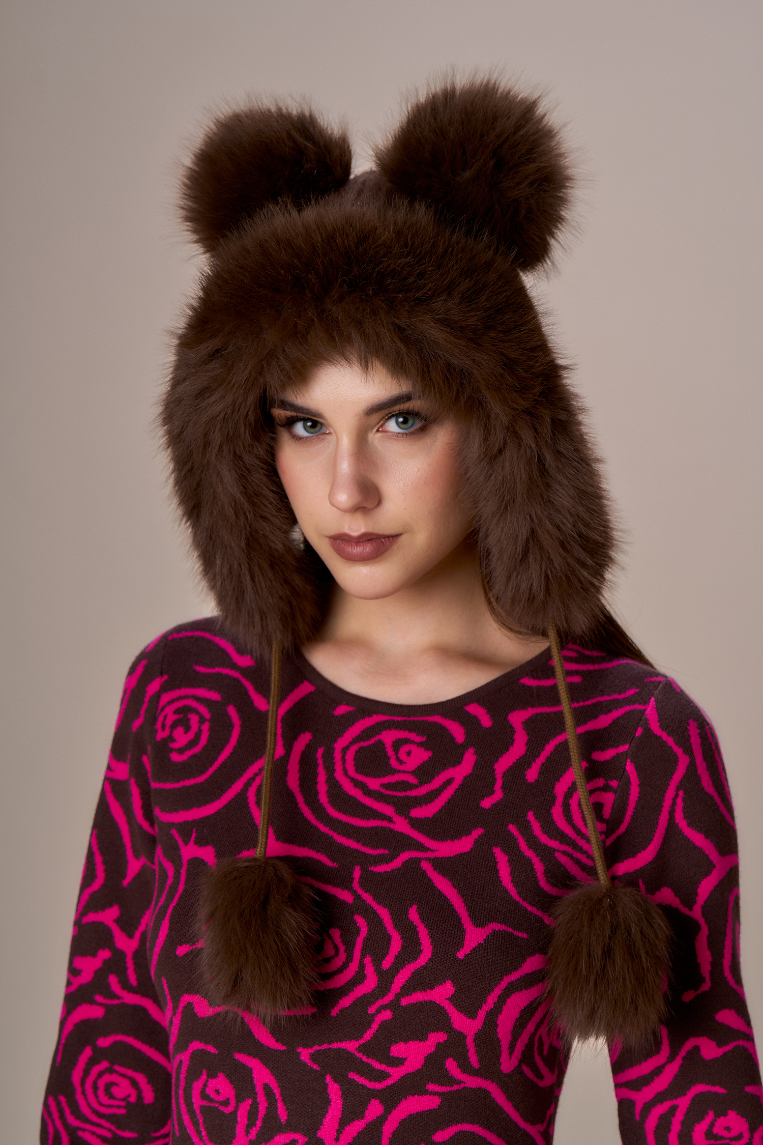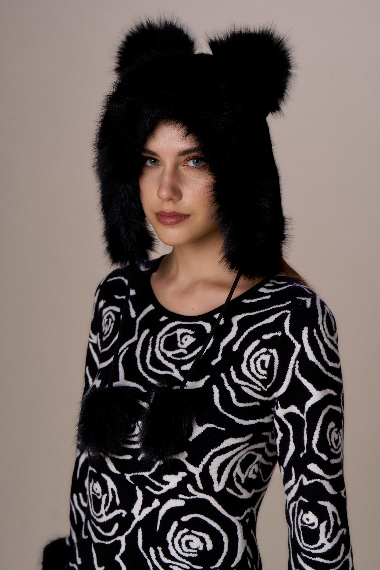 Cappello faux fur con nastri pom pon