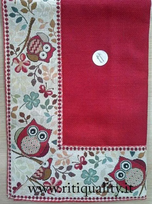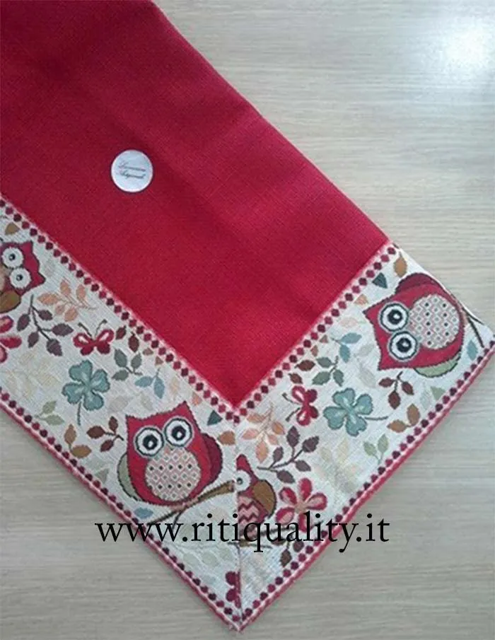 Centrotavola articolo Gufo disponibile nella variante rosso con bordura avorio arricchita da una simpatica fantasia civetta. In bellissimo tessuto gobelin. Ideale per dare un tocco di colore e allegria al tuo ambiente con questo centrotavola. Lavorazione artigianale. Misure: 90 cm x 90 cm. Prodotto Made in Italy.