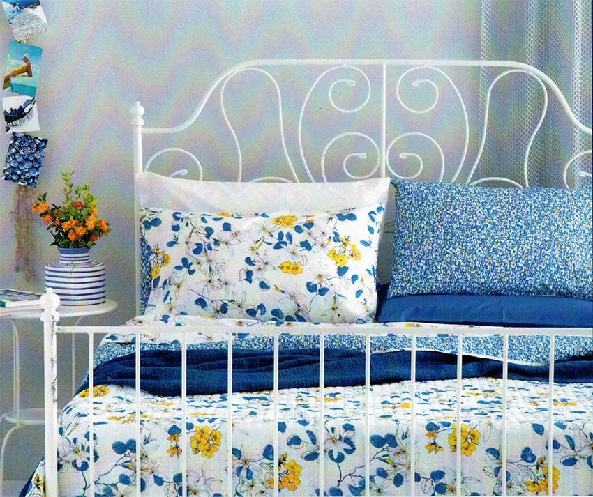 Completo Lenzuolo Matrimoniale art. LN0110 GELSOMINO. Bellissima fantasia stampa floreale che rallegra anche l’arredo del tuo letto. Abbinamenti di colori vivaci e particolari come il colore Beige a contrasto con fiori arancio e il colore blu a contrasto con fiori gialli. Completo lenzuolo matrimoniale misura cm 240 X 290 composto da lenzuolo piano con stampa fiorata,lenzuolo sotto con angoli con stampa effetto pied pull e due federe che riprendono da un lato la fantasia fiorata e da un lato fantasia pied pull. Tessuto 100% di puro cotone. MADE IN ITALY.