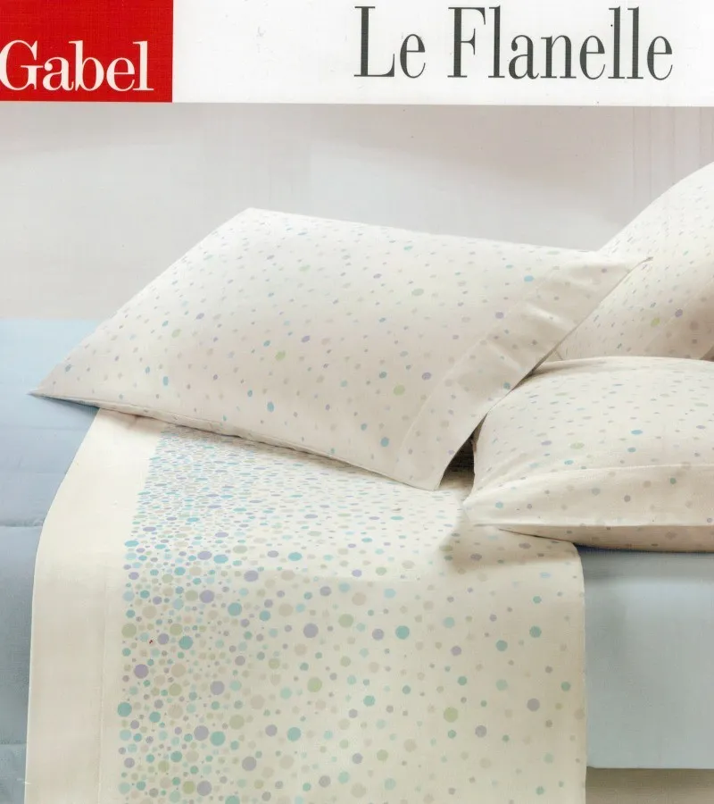 Completo lenzuolo Gabel in flanella stampato su caldo cotone felpato. Il prodotto presenta una simpatica fantasia a pois colorati su fondo panna nel sopralenzuolo e nella federa e il sottolenzuolo tinta unita in variante celeste o rosa riprendendo il colore dei pois. Certificato Oeko-Tex. Misura disponibile: Sopralenzuolo 160×285 cm, sottolenzuolo con angoli 90×200 cm, federa 50×80 cm.