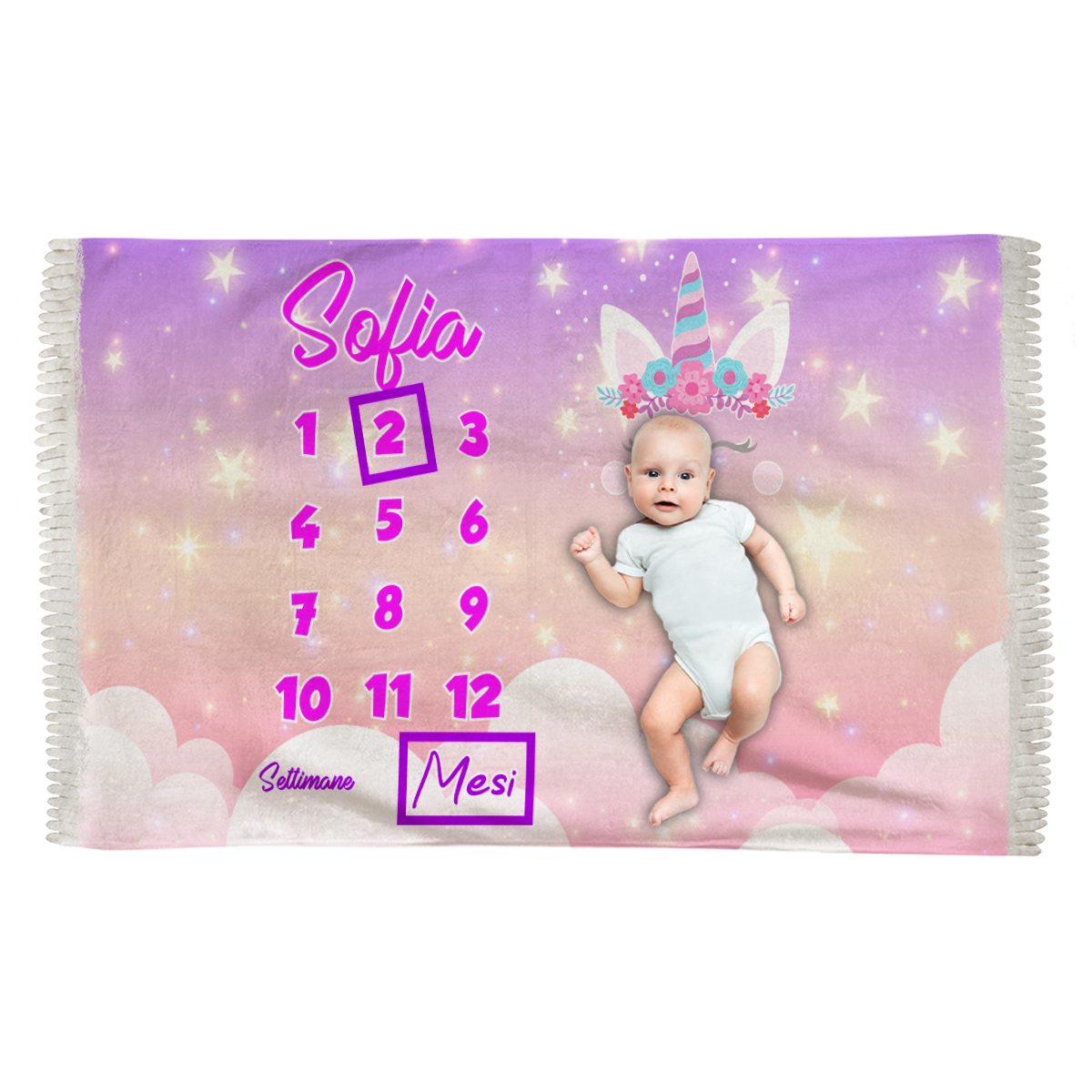 Coperta Mesi Neonato – Personalizzabile [NOME] – Unicorni – Rosa –