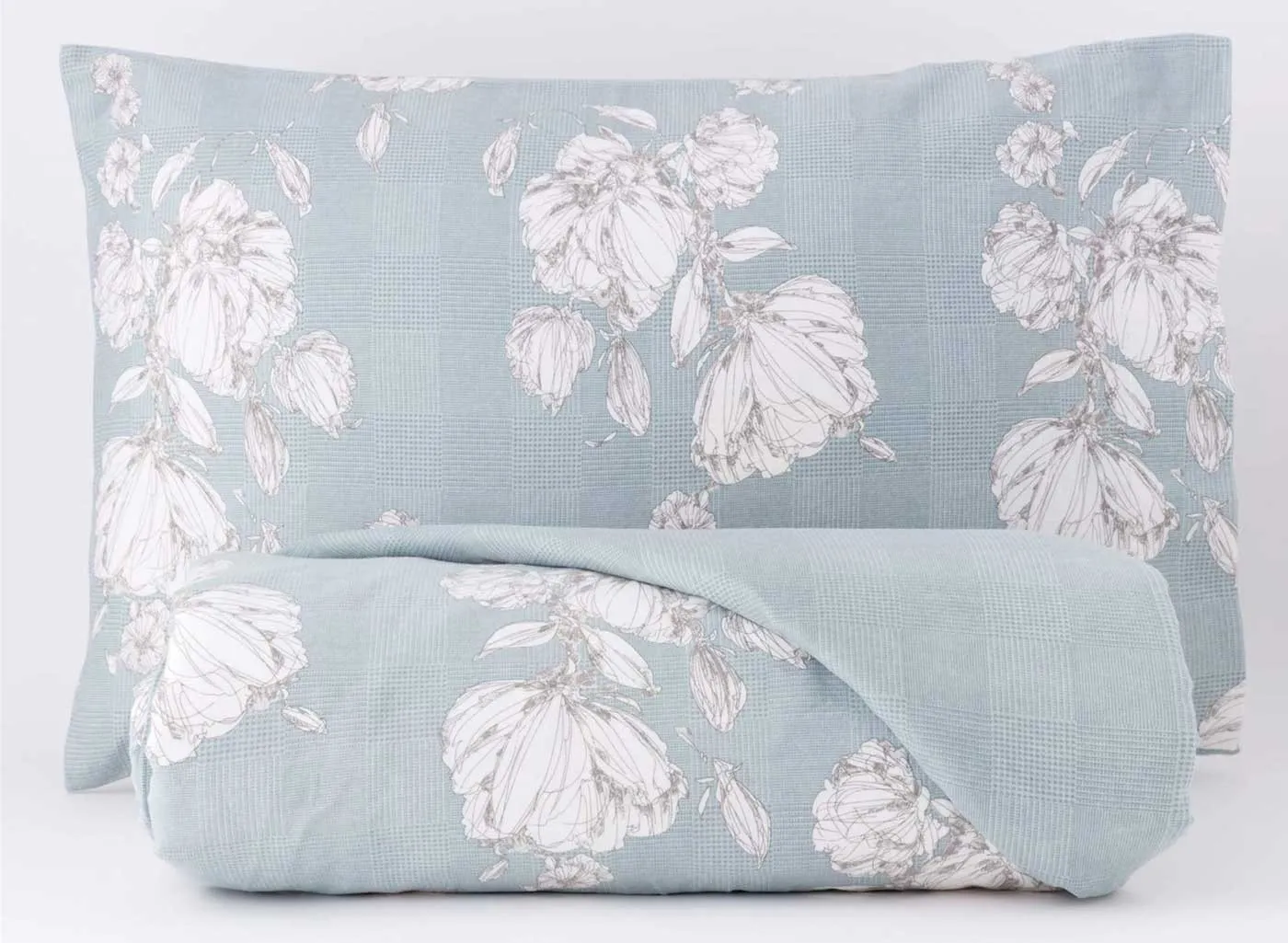 Parure Copripiumino Giverny Matrimoniale misura 250X200 centimentri. Questo Copripiumino e’ in 100% cotone, sacco copripiumino piu’ due federe coordinate. Ha una fantasia fiorata su fondo a quadrucci effetto piedipull disponibile nel colore celeste. Marca: Riviera ย
