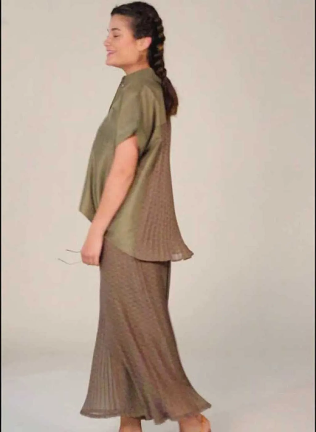 Egatex. Camicia donna mezza manica con la parte frontale verde e con bottoni. Parte posteriore plissettata e conpiccoli fiori rosa ripetuti. Lavare a massimo 30 gradi.