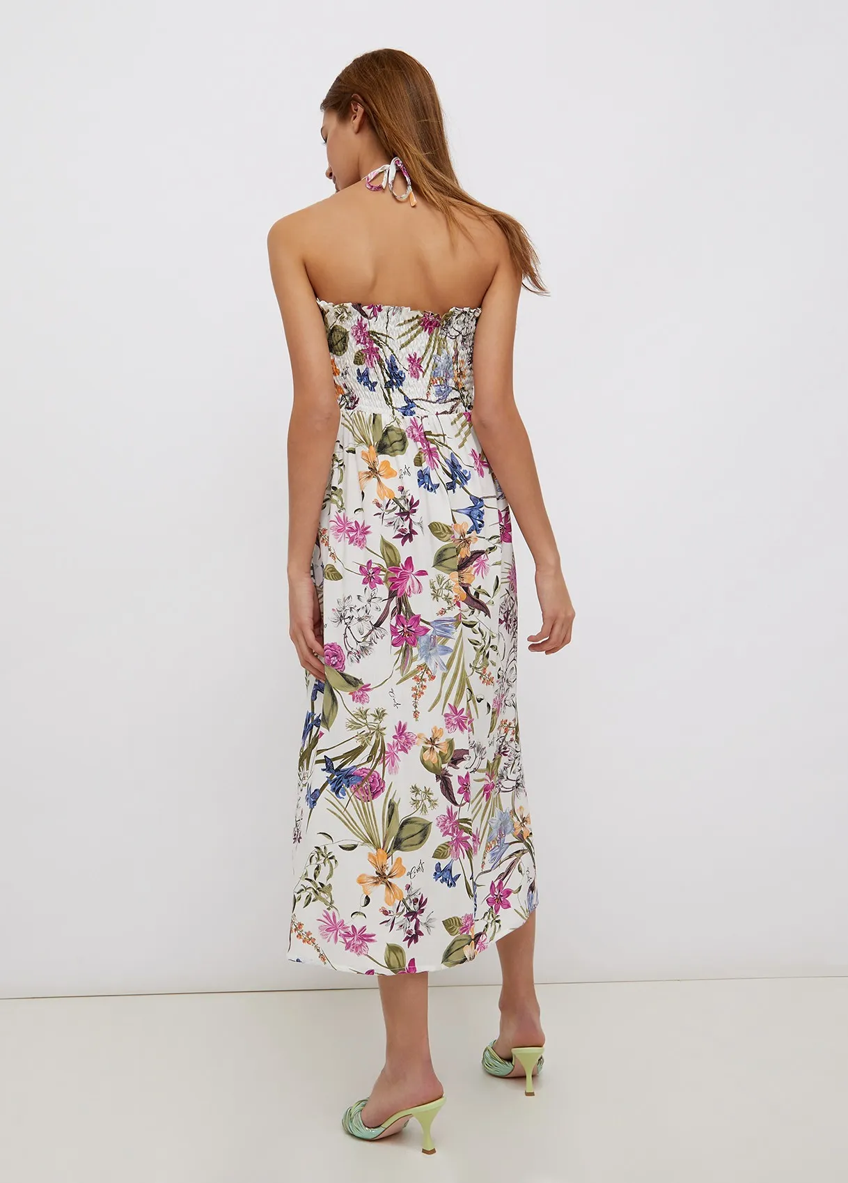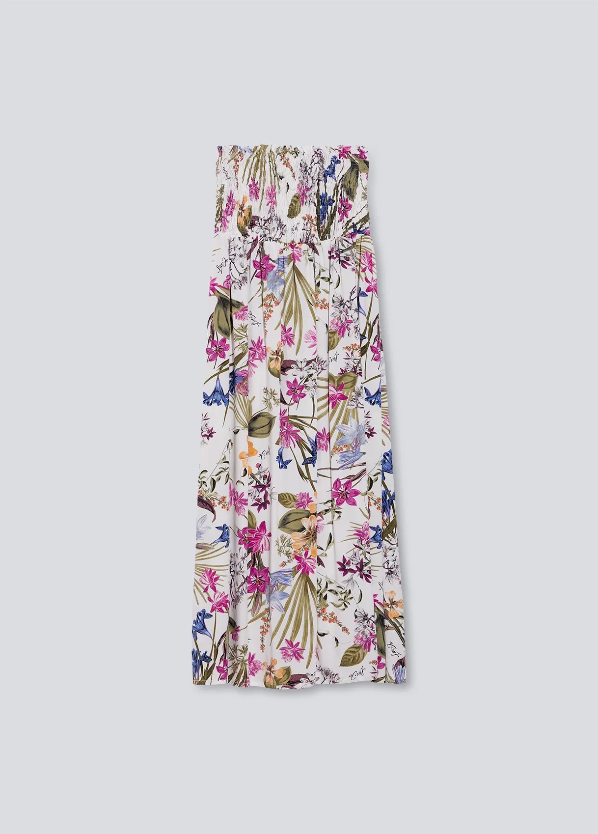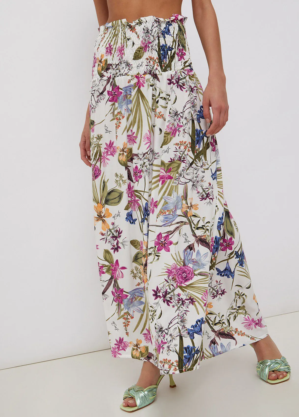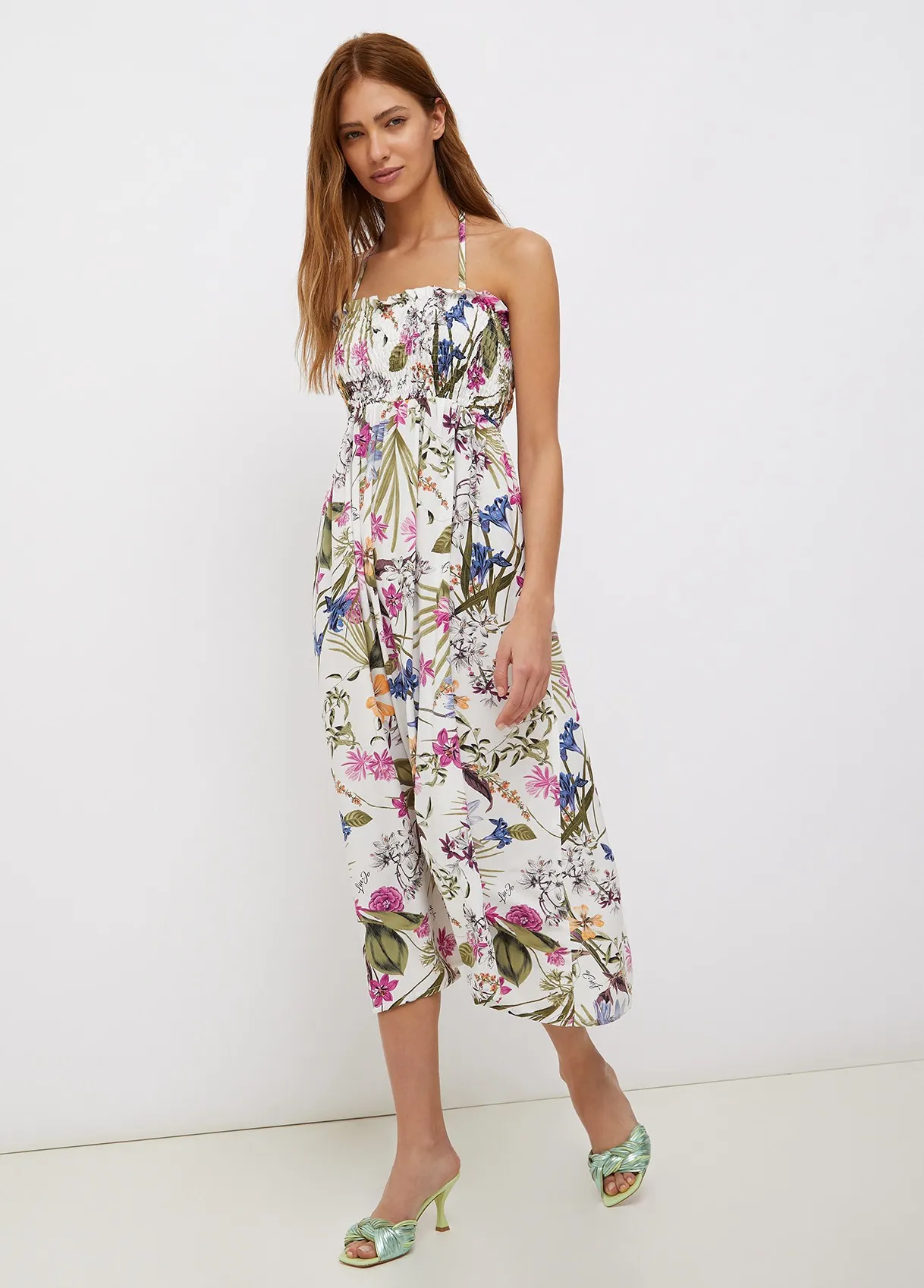 Gonna lunga stampa floreale jungle Liu Jo . Tessuto leggero e comodo, con parte superiore arricciata, con delle pieghe leggere che creano movimento e donano fascino alla silhouette. Dettaglio stella in metallo con strass centrale posta sul davanti. I lacci inseriti nella parte superiore e la parte arricciata conferiscono una doppia funzionalità, può essere usata anche come abito. Sensuale e pratico. Disponibile con fondo bianco o fondo nero.