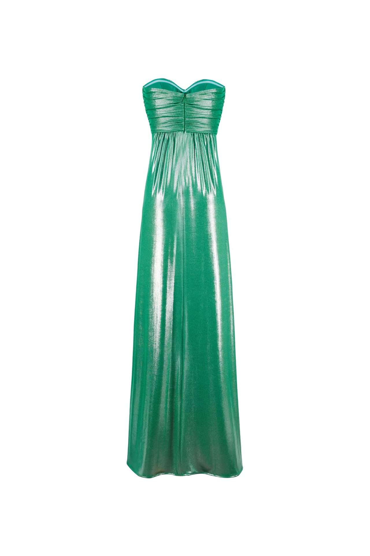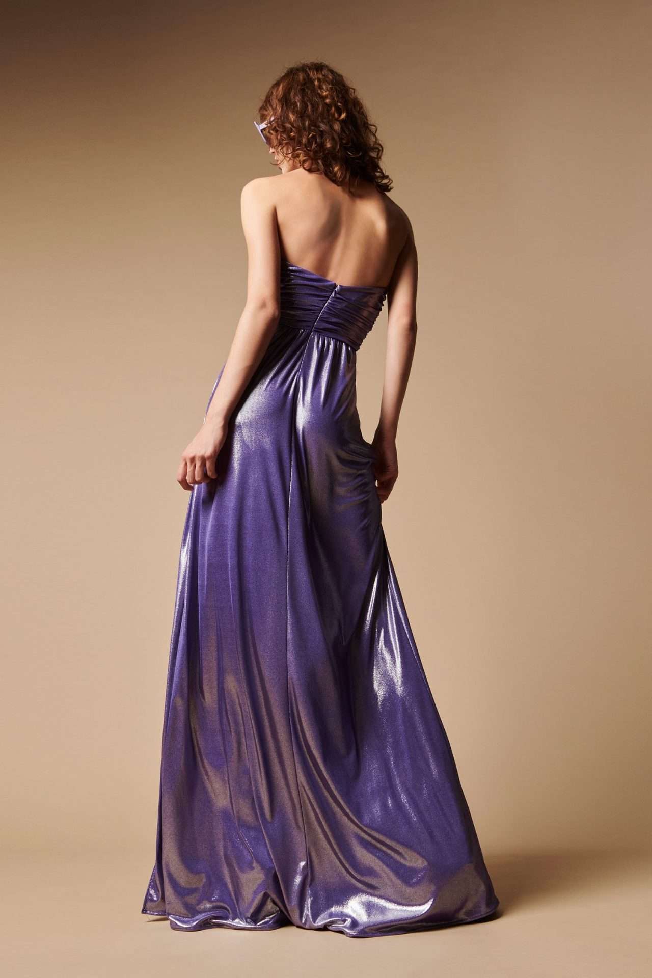 Abito lungo a fascia in jersey laminato, con dettaglio cuore strass.