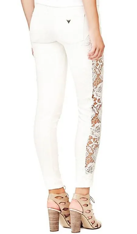 NUOVA COLLEZIONE 2018. Pantalone donna Guess art. W82A12D2G65 modello 5 tasche, chiusura zip e bottone in madreperla. Capo ideale da indossare con una blousa o una t-shirt per rendere il tuo look sempre di grande tendenza con un pantalone classico dal taglio moderno e iperfemminile grazie al suo dettaglio laterale interamente in tulle ricamato. Vestibilitร skinny con gambale stretto. Composizione: 98% cotone, 2% elastan. Marca: Guess.