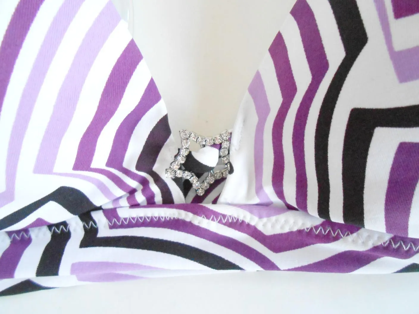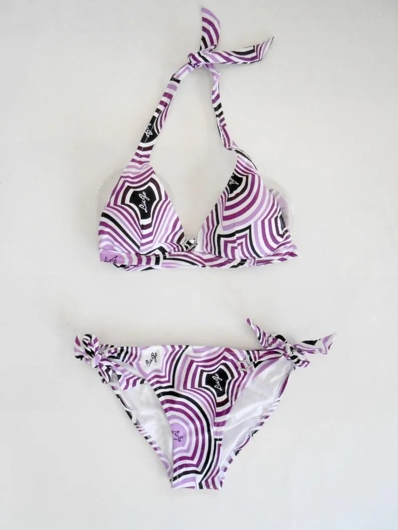 Costume donna Bikini Liu Jo art. V14031 J6996 logato. Reggiseno modello triangolo imbottito legato al collo con coppette estraibili. Slip modello vita bassa regolabile con laccetti laterali, sgambato. Applicazione ciondolo stella in metallo con luminosi strass. Bikini con bellissima fantasia dai toni del viola. Composizione: 100% Lycra. Marca: Liu Jo.