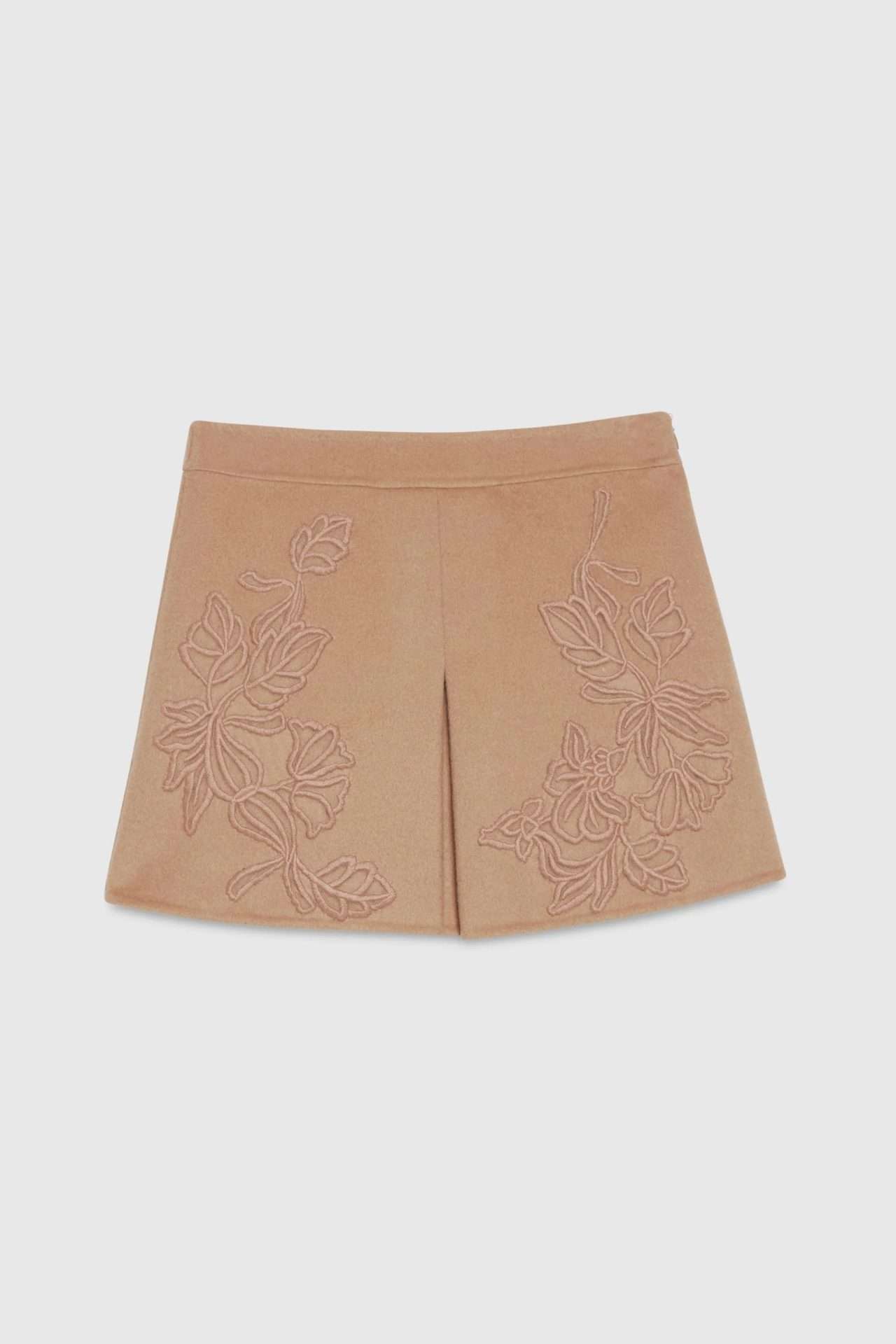Minigonna in double di lana con piega al centro davanti e preziosi ricami in lana in tono. Sfoderata, zip sul fianco.