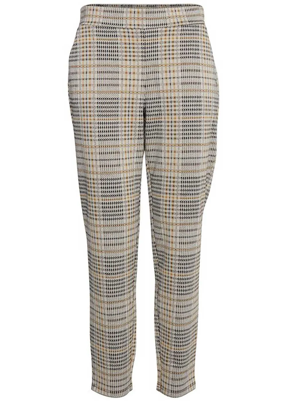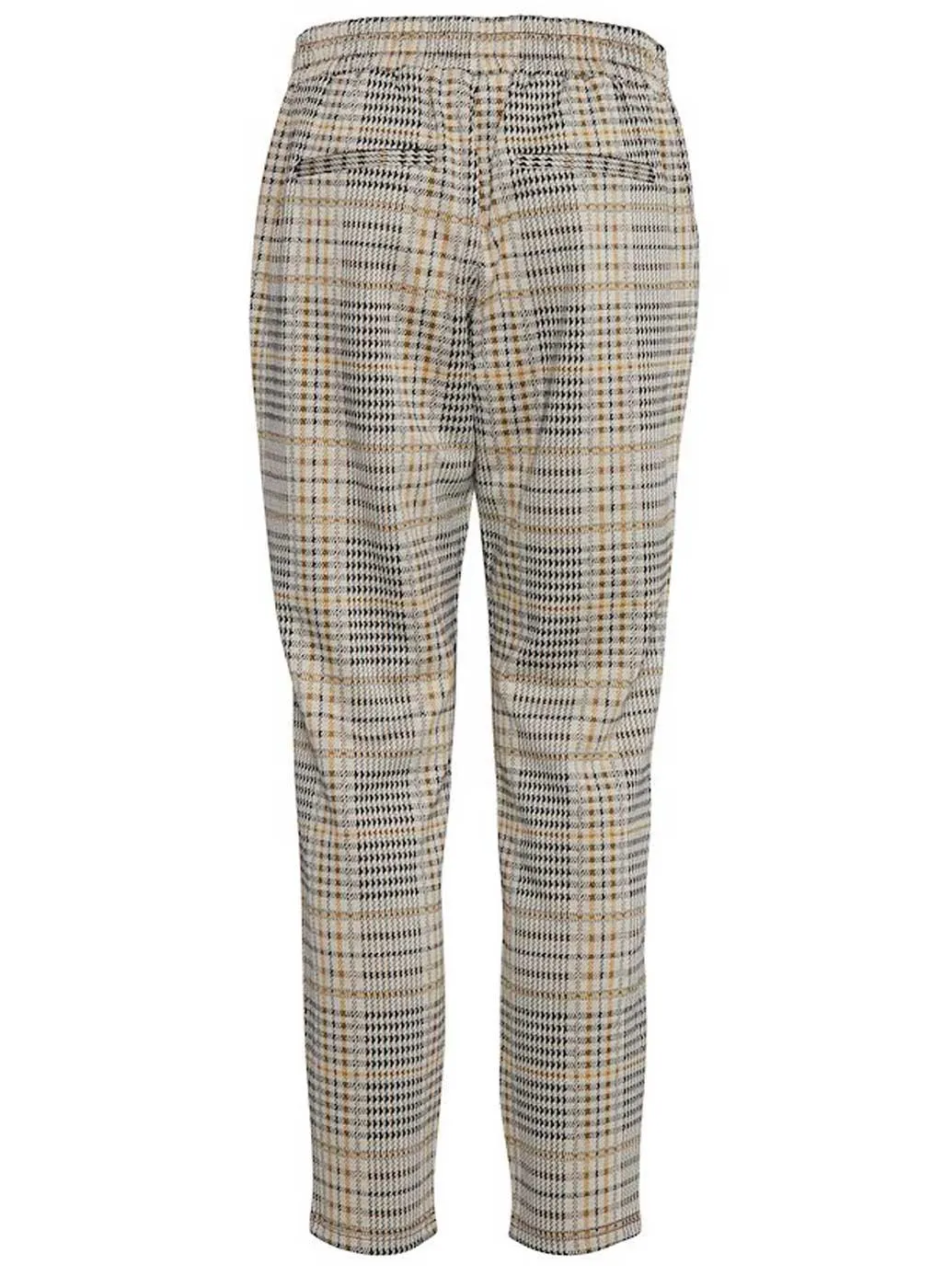 Jogging Donna B.Young Art. 20807565. Pantalone modello jogging con elastico in vita sul retro per una migliore vestibilitร e comodo tessuto in misto viscosa con tasche a filo. Particolare fantasia a piedipull dai toni beige/nero/senape su fondo panna. Comodo e pratico da indossare in qualsiasi occasione per rendere piรน chic il tuo outfit. Composizione: 85% Poliestere 12% Viscosa 3% Elastane. Marca: B.Young.