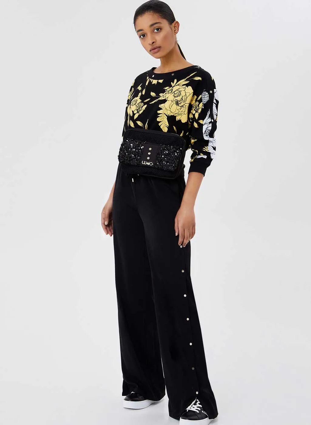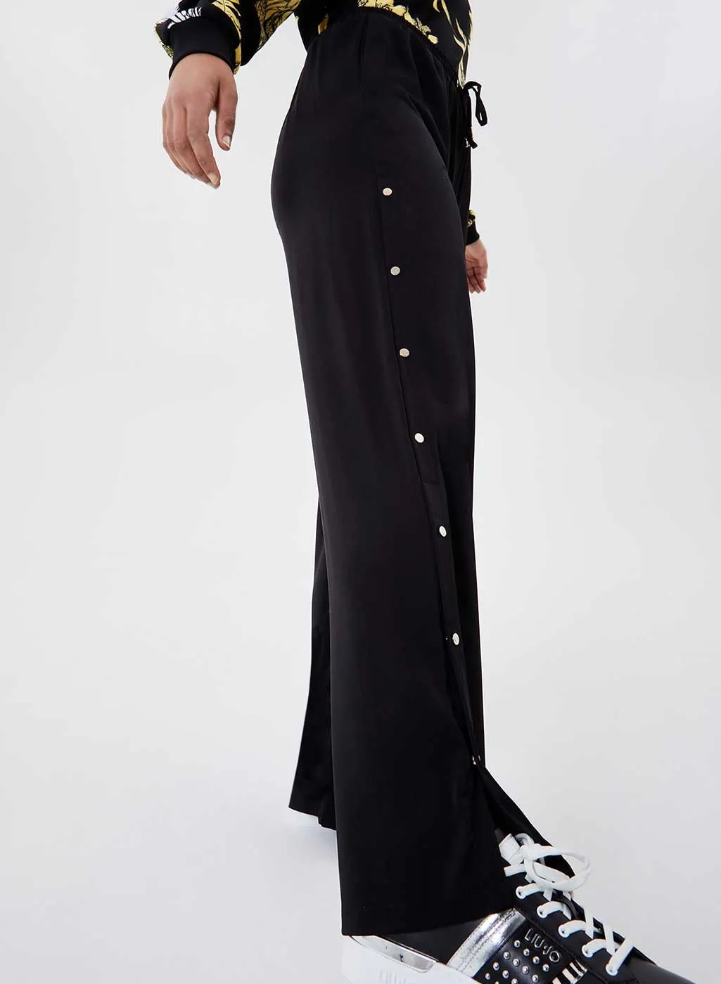 Pantalone donna marca Liu Jo,con inserti laterali a bottoncino dorati con logo,modello largo,tessuto poliestere 97%,3% elastane.
