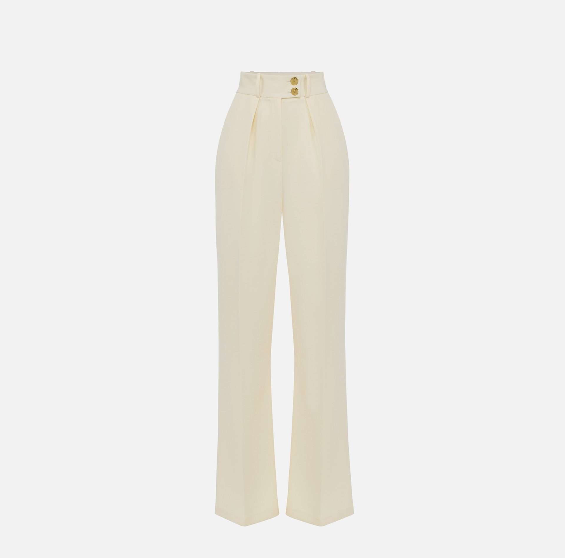 Pantaloni in crêpe fluido con vestibilità dritta. La costruzione con pinces regala volumi sofisticati mentre i bottoni con logo in metallo dorato impreziosiscono la vita e le patte sul retro.