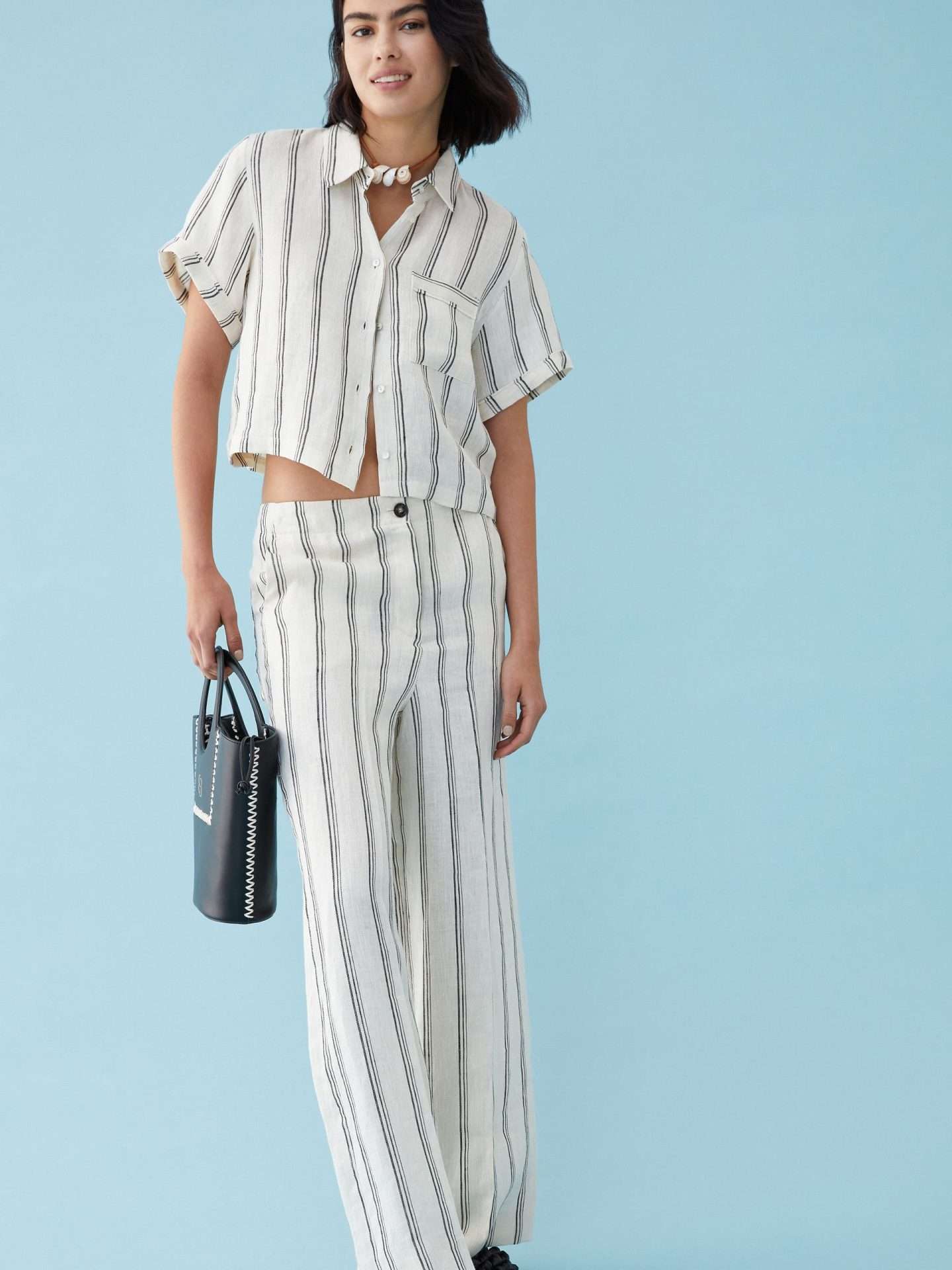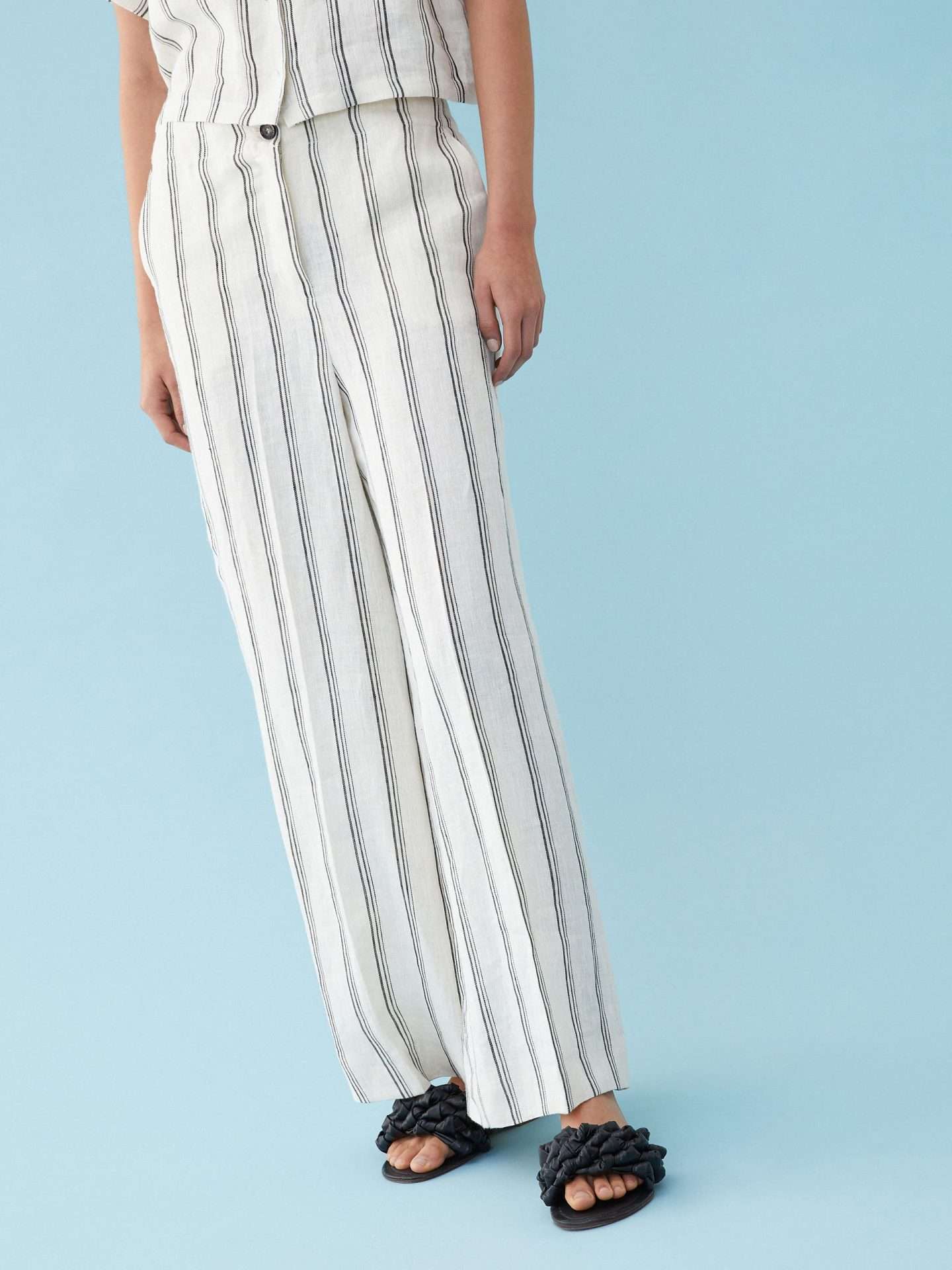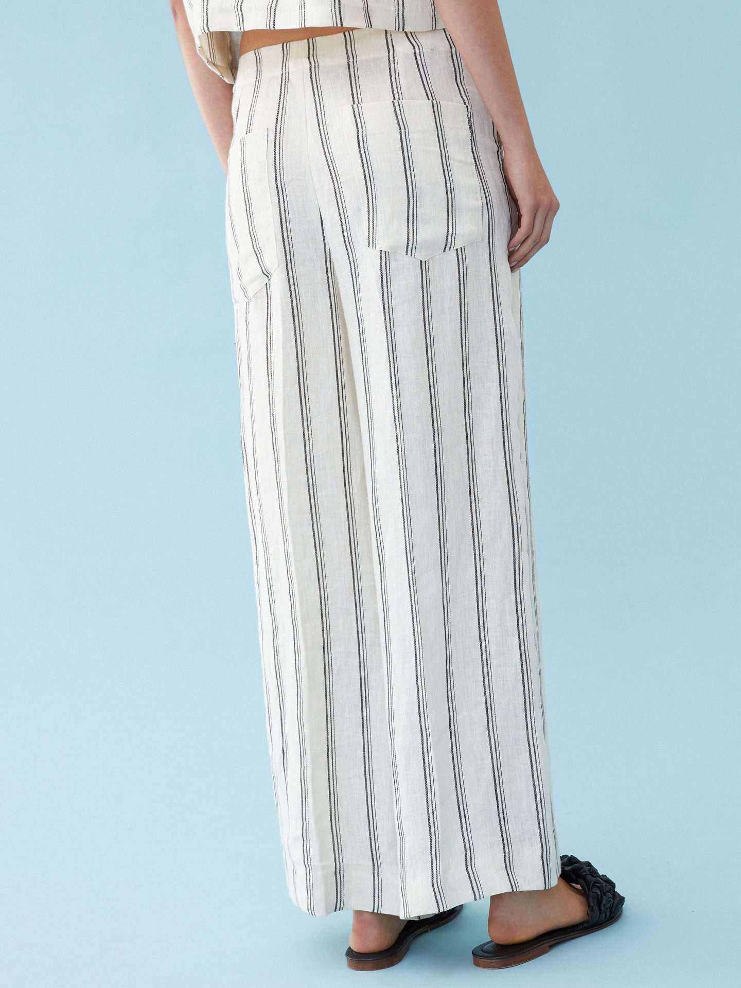 Pantaloni in lino dalla linea ampia wide leg, chiusi con zip nascosta e bottone. Tasche alla francese davanti e applicate dietro. Piega stirata. Tessuto contenente cotone proveniente da una catena di fornitori impegnati in un’agricoltura a basso impatto ambientale.