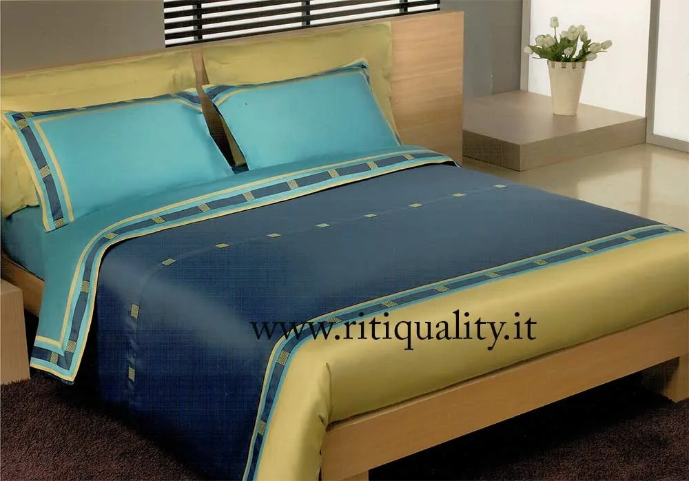 Set copripiumino matrimoniale maxi. Prodottoย Made in Italy.ย Elegante e raffinato dal gusto moderno questo bellissimo completo copripiumino รจ composto dal sotto lenzuolo piano 290×270 cm, sacco 250×200 cm, 2 federe. Il copripiumino haย dettagli ricamati e particolari abbinamenti di colore. Disponibile in due varianti: blu e turchese con dettagli verde mela; terra di siena e oro con dettagli marroni.