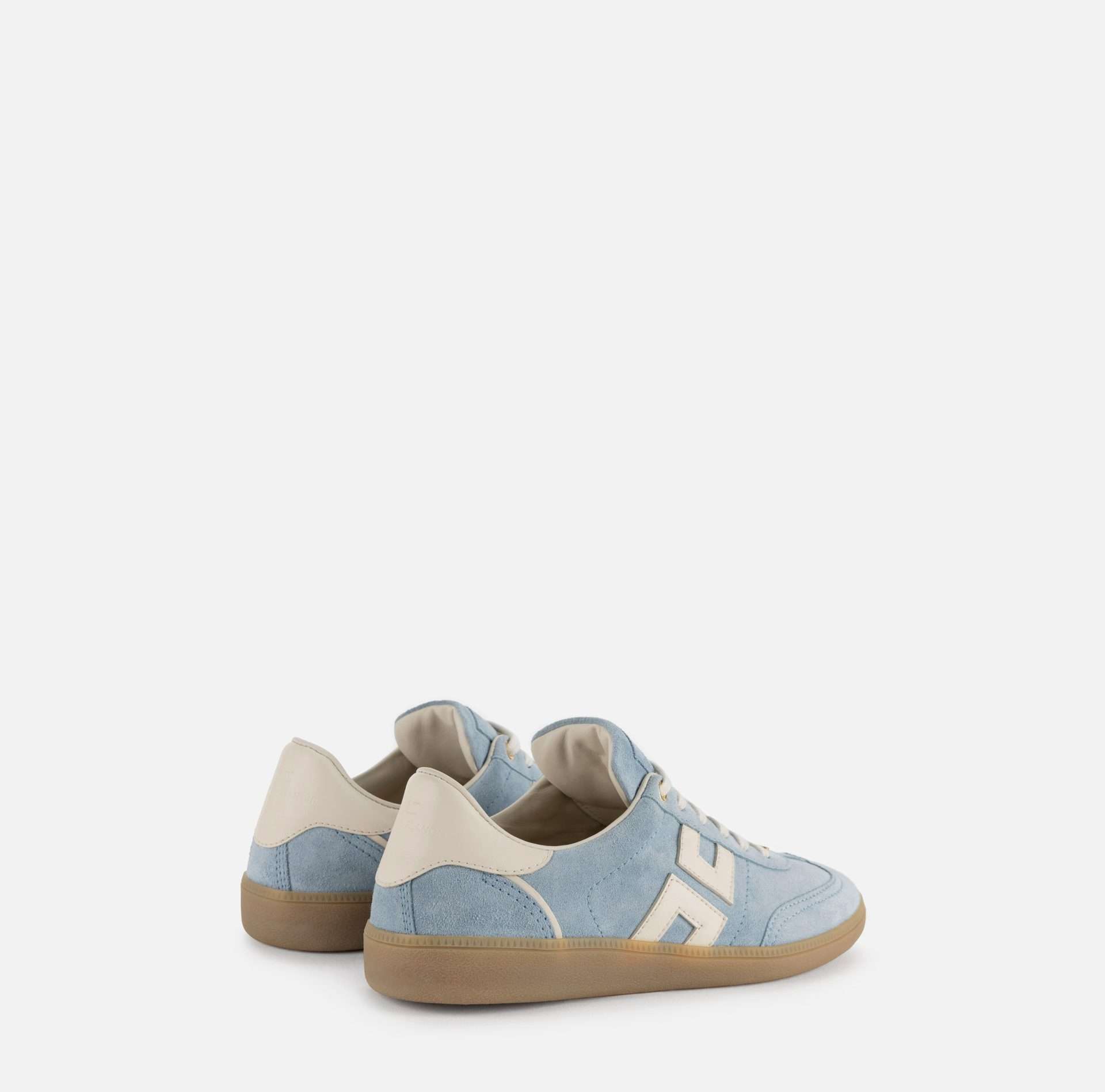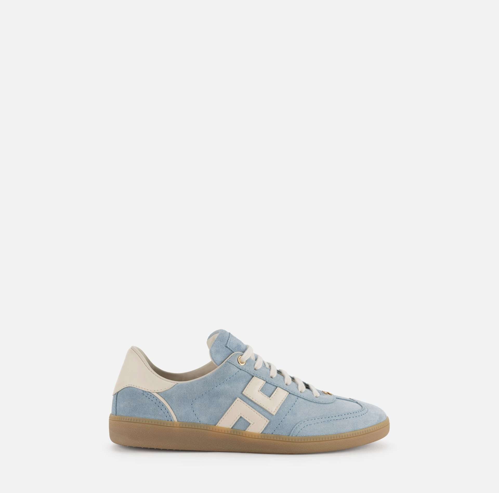 Scarpe da ginnastica realizzate in un mix di crosta e nappa, decorate da un’applicazione logo e da un rivetto in metallo color oro che firma il design. Suola in gomma.