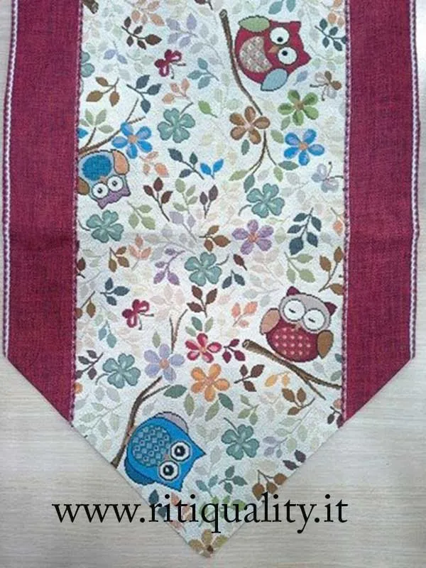 Striscia esagonale articolo Gufo variante rosso con simpatica fantasia civette centrale e interamente bordato rosso tinta unita. Striscia ideale per ravvivare il tuo ambiente con un tocco di colore. Bellissimo tessuto gobelin. Misure: 40 cm x 110 cm.