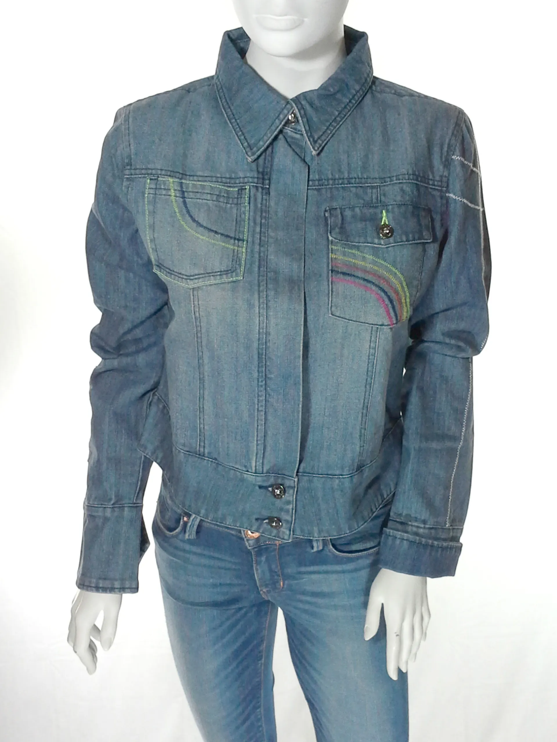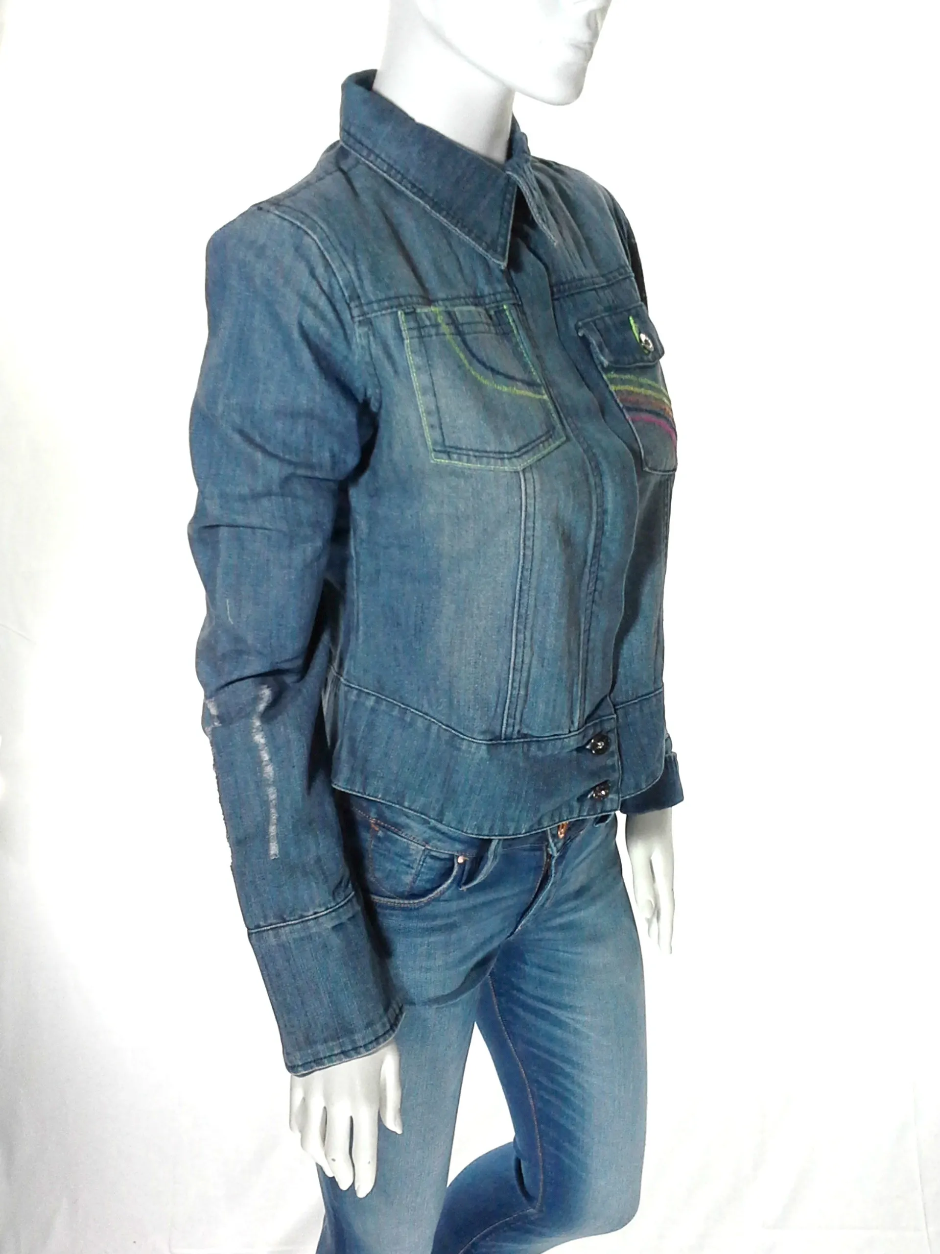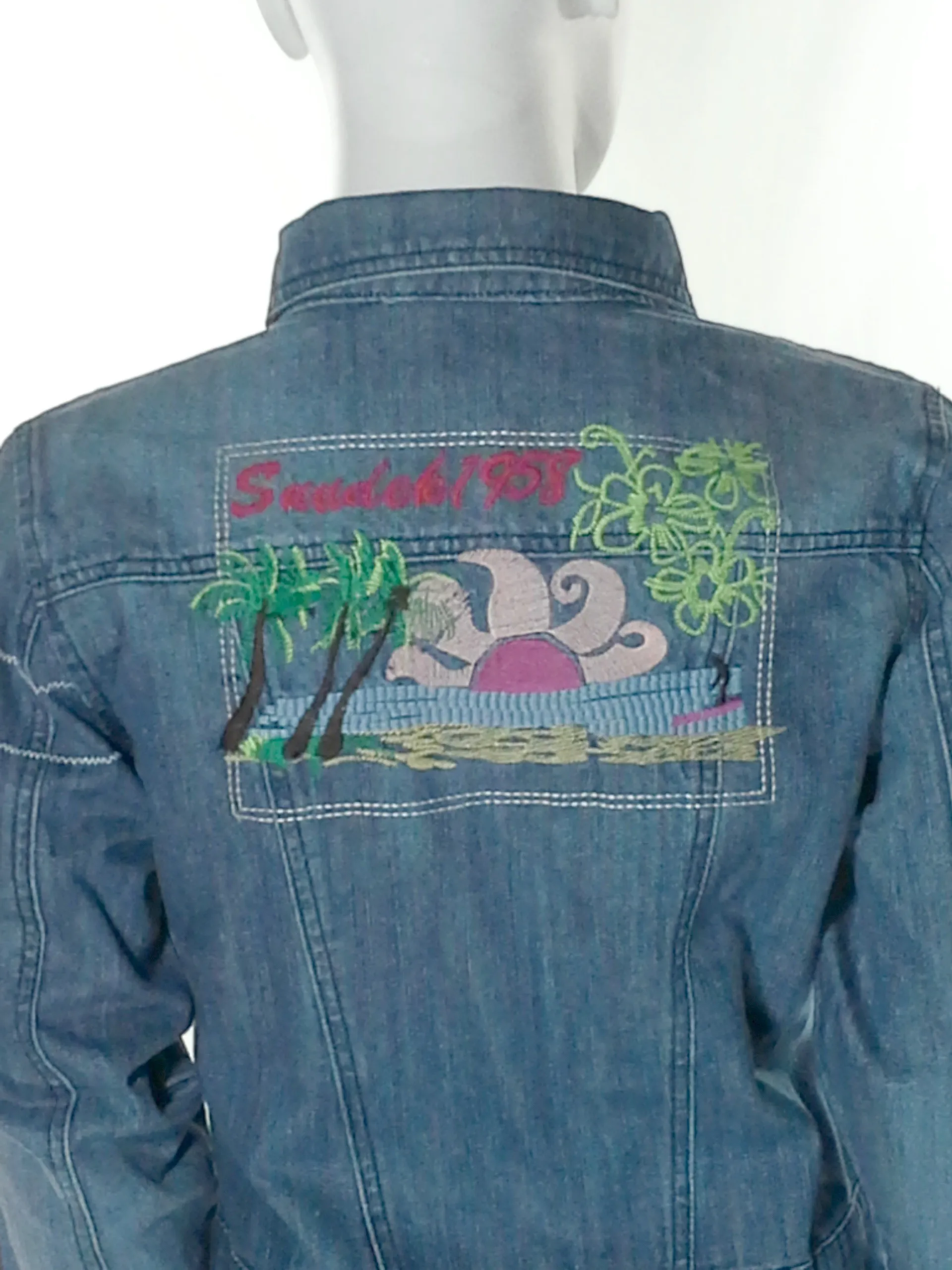 Sundek donna Giubbino a jeans art. 6WD03 con chiusura cerniera a scomparsa e bottoni con strass. Piccolo taschino. A rendere particolare e unico questo giubbino รจ il disegno ricamato sul retro e l’effetto used presente in una manica. Tessuto denim 100% cotone. Vestibilitร slim. Marca: Sundek. ย ย ย ย ย ย