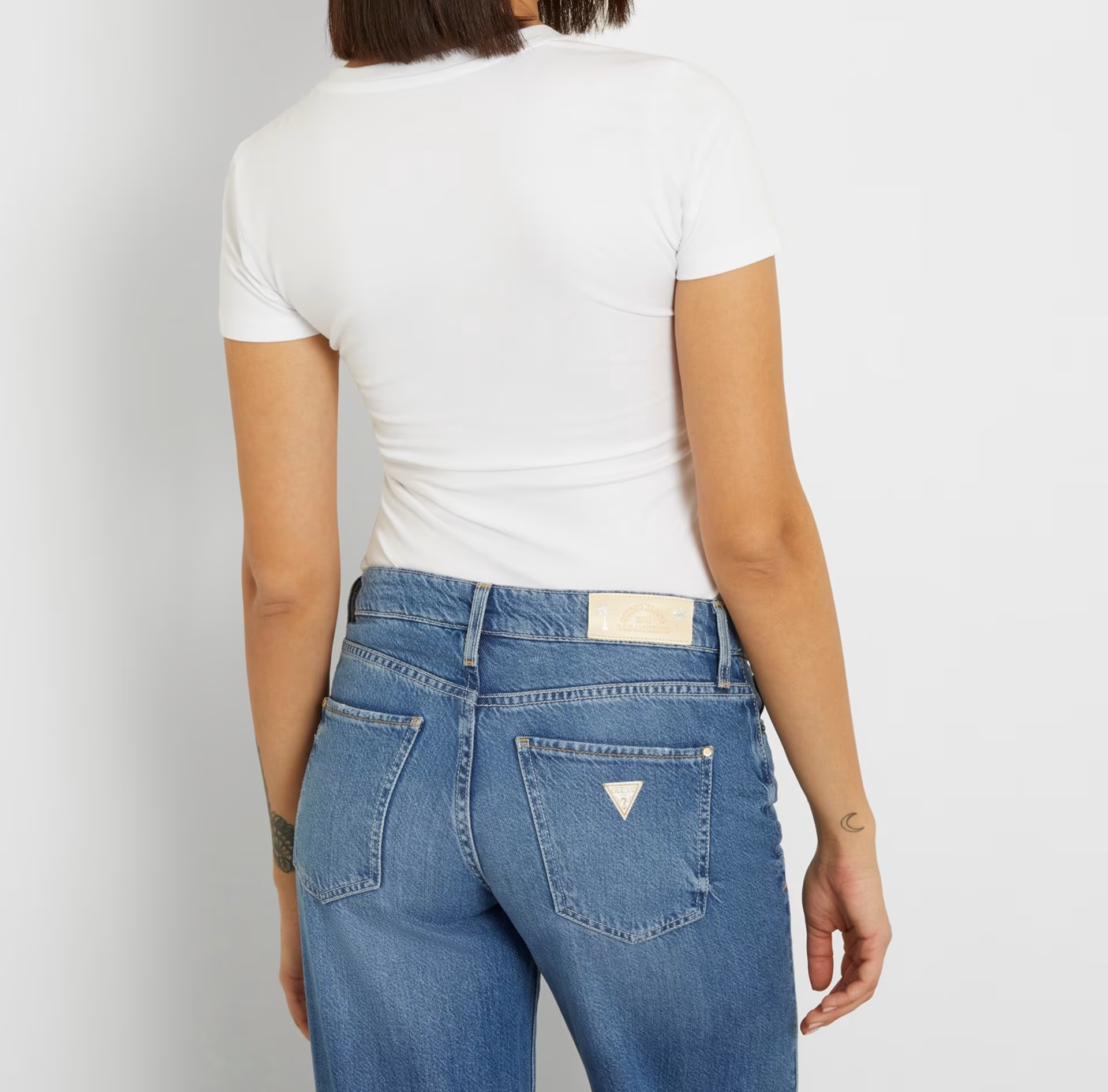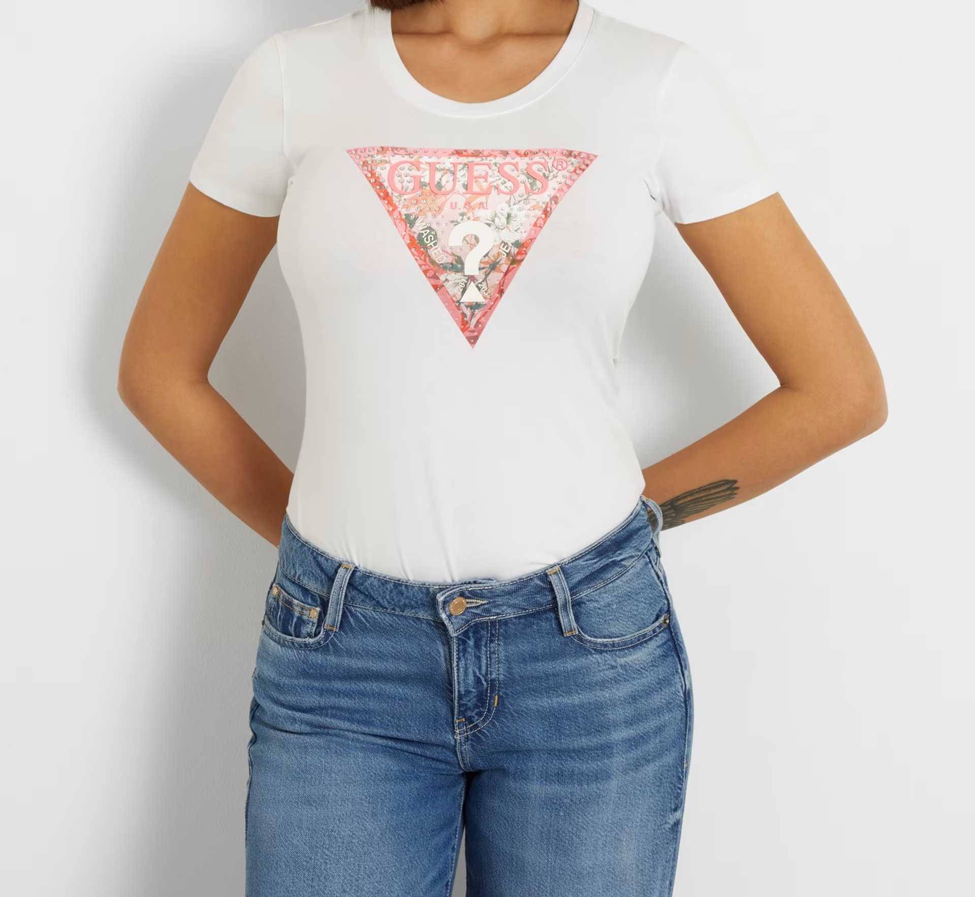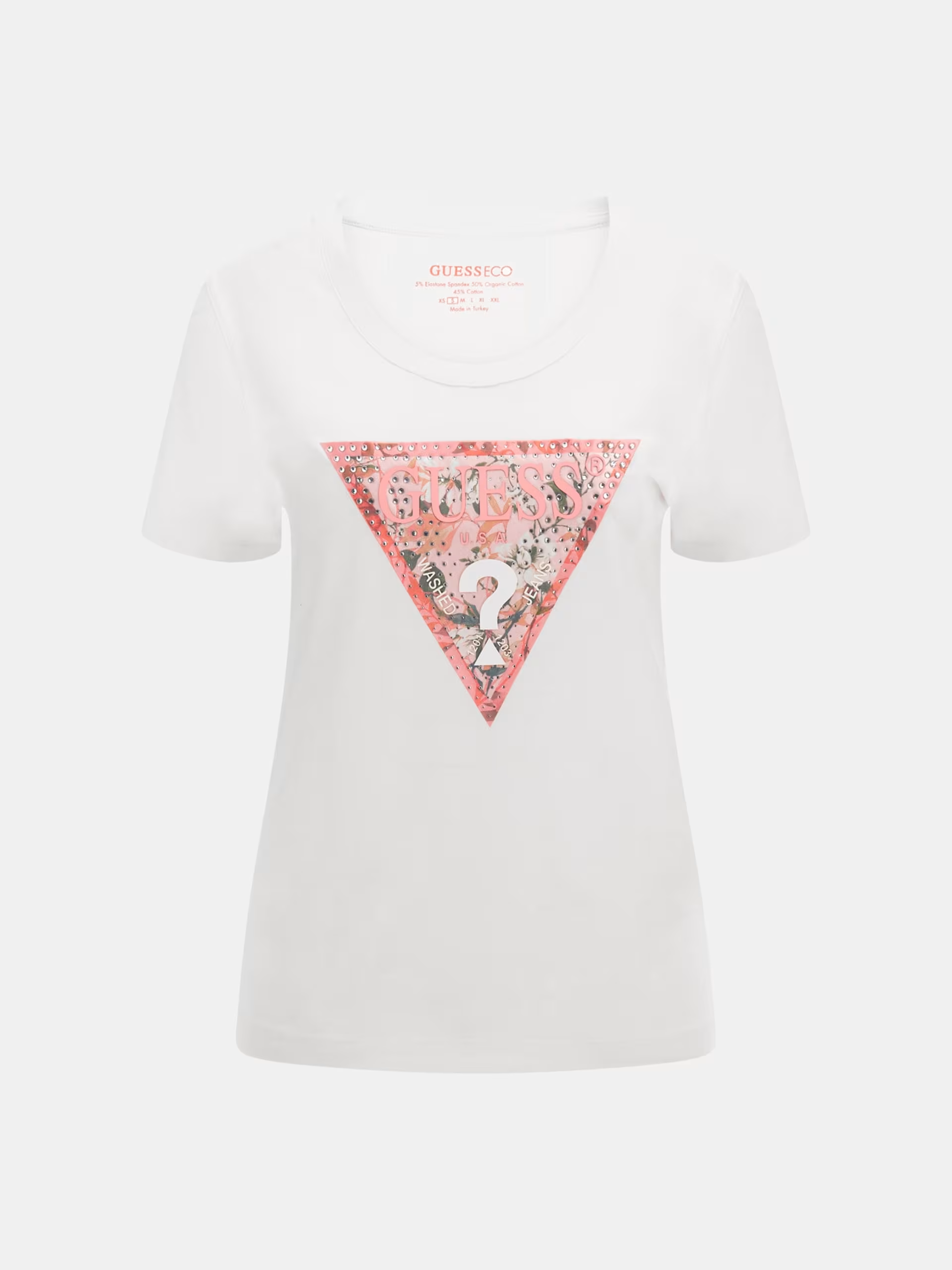 Guess T-shirt in jersey, maniche corte, girocollo, slim fit, grazioso motivo triangolo sul petto decorato con micro brillanti, 95% cotone, 5% elastano