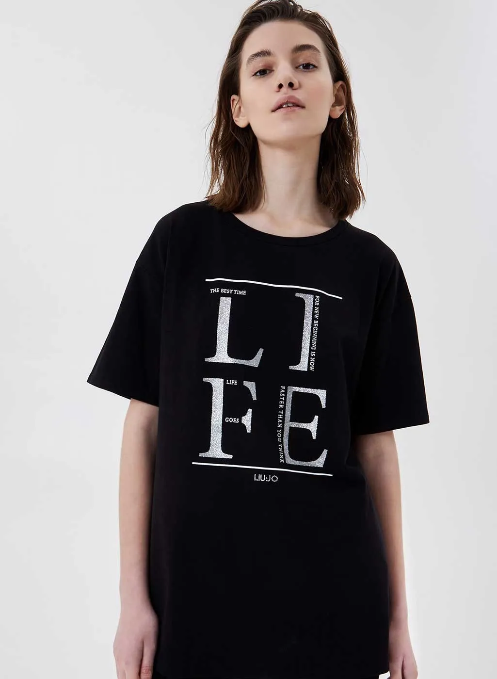 T-shirt donna Liu JO con stampa glitter e strass,maniche corte,vestibilitร comoda,95% cotone,5% elastan.