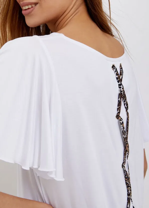 T-shirt donna Liu Jo con laccio incrociato dietro con stampa animalier con possibilitร di fare un fiocco all’estremitร che dona un tocco fashion e particolare. Vestibilitร morbida che la rende comoda e casual. Manica corta con rifinitura e taglio a ventaglio che la rendono unica. ll motivo a treccia dell’incrocio posteriore con borchie metalliche crea un’apertura sulla schiena che permette di essere sempre alla moda vestendo in comoditร .