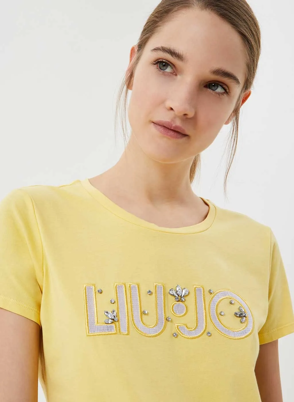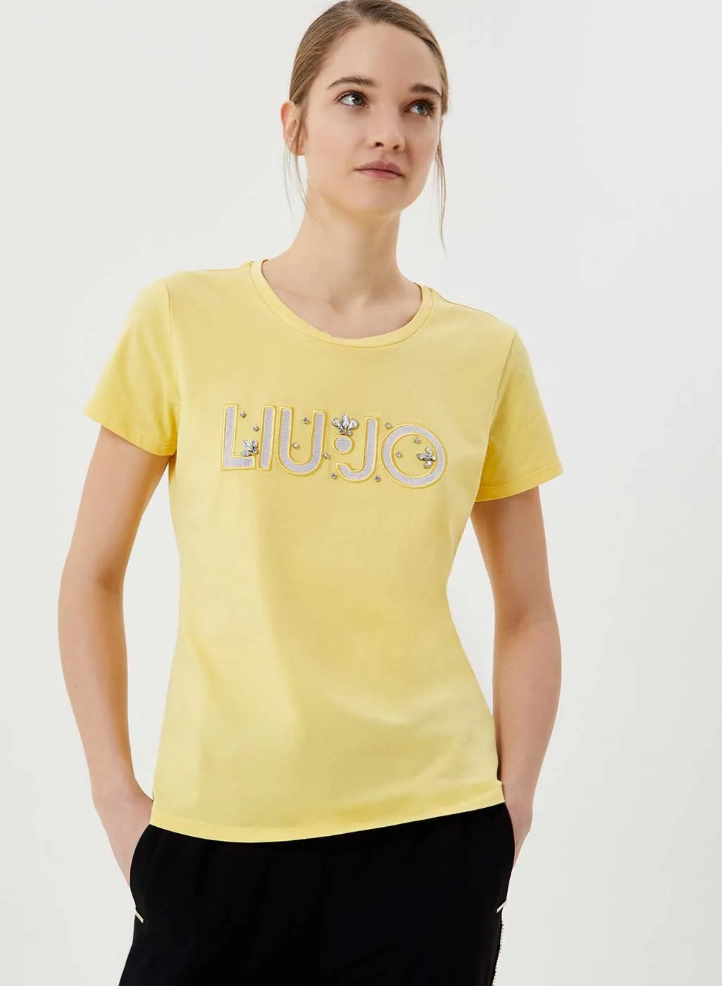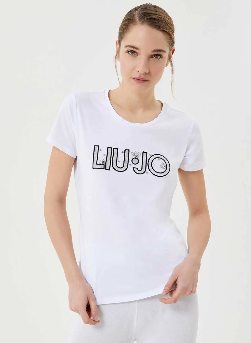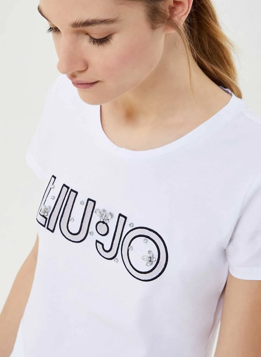T-shirt donna Liu Jo con logo art. TA1026J5003, t-shirt maniche corte in cotone stretch, finti gioielli ricamati sulla parte frontale, disponibile in 3 colori. Composizione 95% cotone, 5% elastane marca Liu Jo