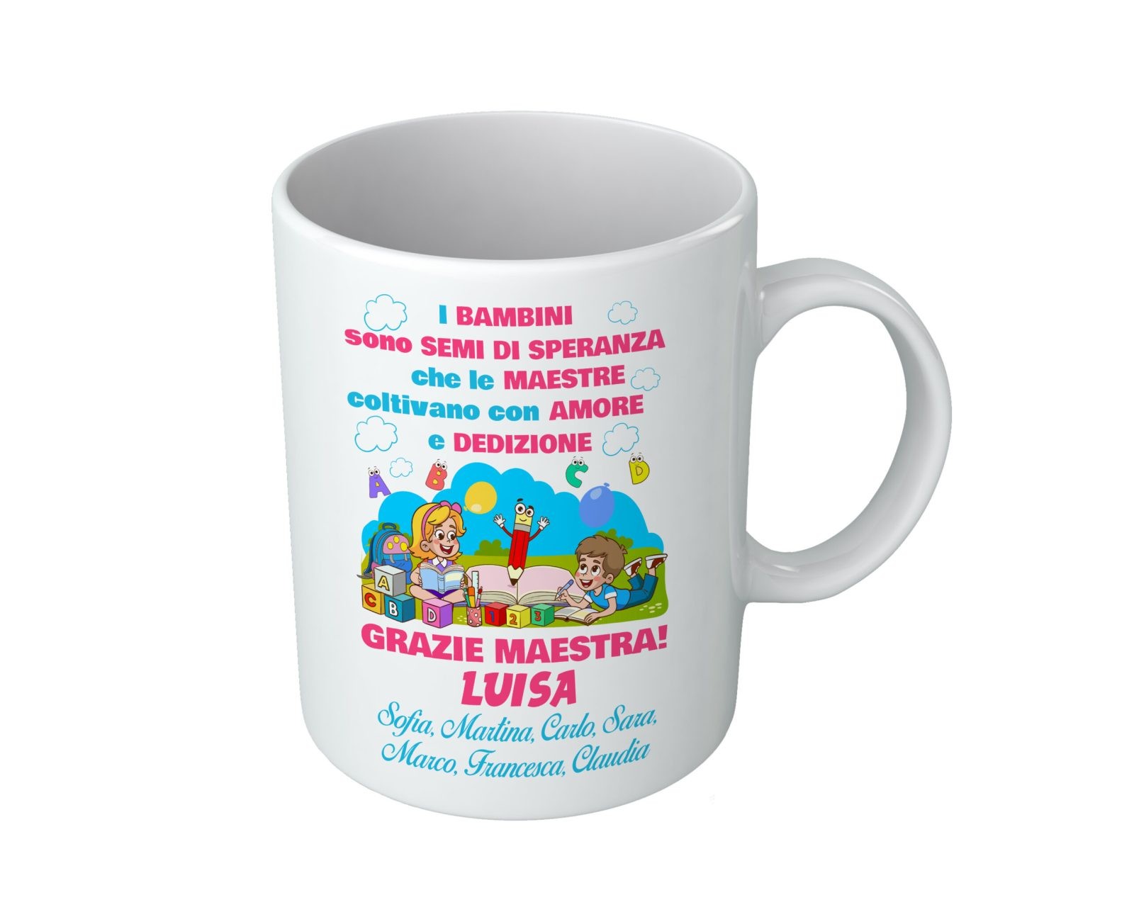 Tazza Maestra con Nomi e Classe Personalizzabili, sorprendi un’insegnante speciale con un regalo pensato appositamente per lei! Inserisci la tua personalizzazione tramite il pulsante PERSONALIZZA.