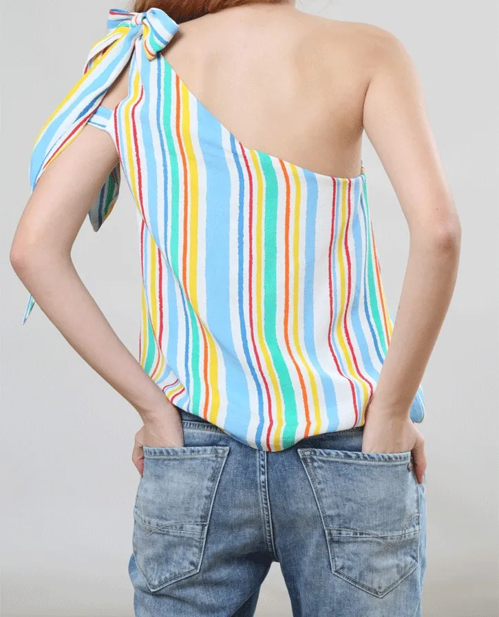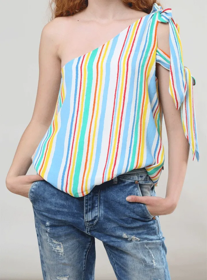 NUOVA COLLEZIONE 2018. Top donna asimmetrico Pepe Jeans art. PL302322 LUNA monospalla con chiusura sulla spalla con fiocchi. Morbido tessuto fluido in viscosa. Capo ideale da indossare con un denim o un pantalone per rendere il tuo look di grande tendenza indossando un capo particolare e cool. La fantasia multicolor a righe completa il top rendendolo un capo must have di stagione. Vestibilitร regolare. Composizione: 100% viscosa. Marca: Pepe Jeans. ย ย