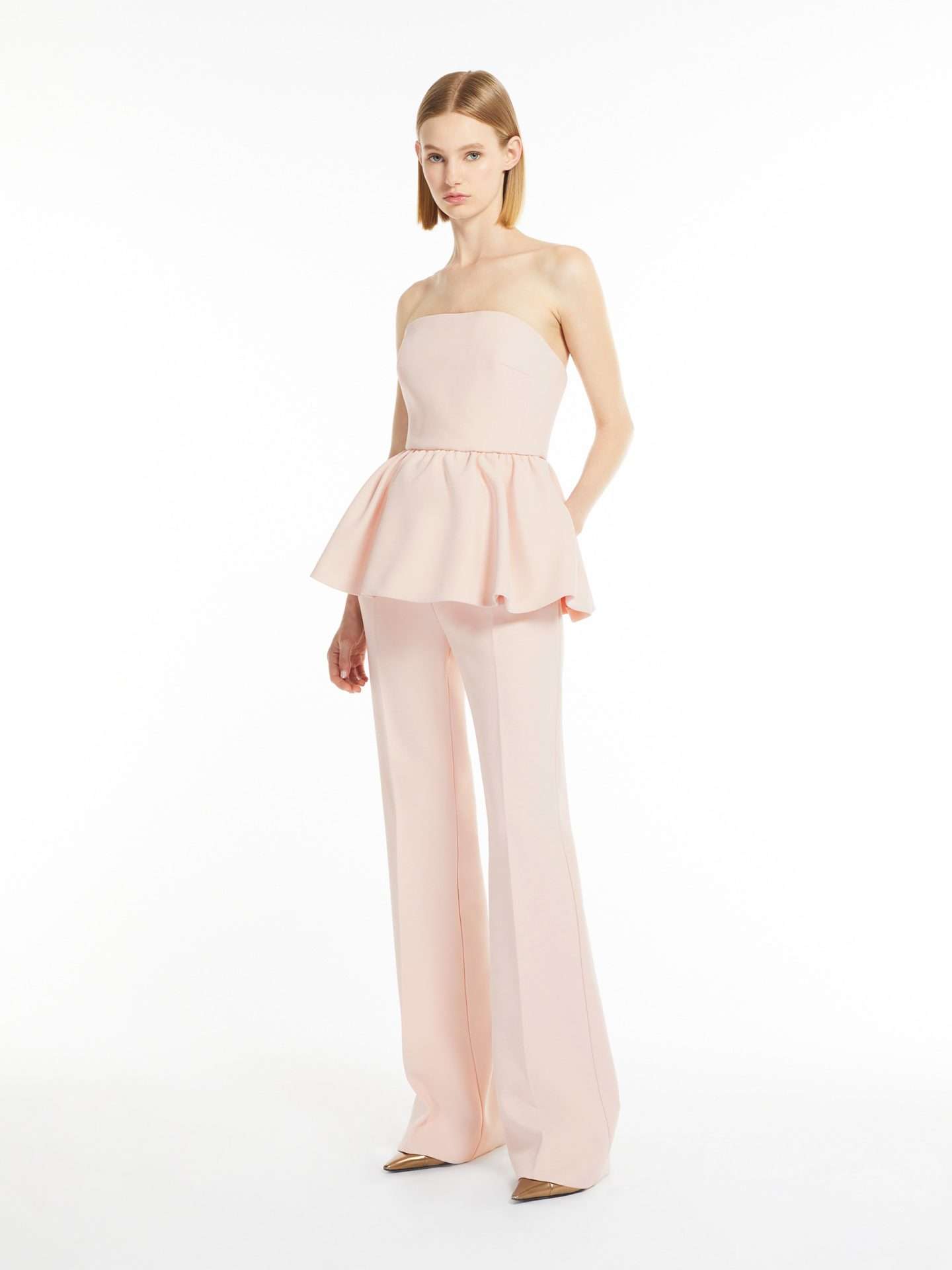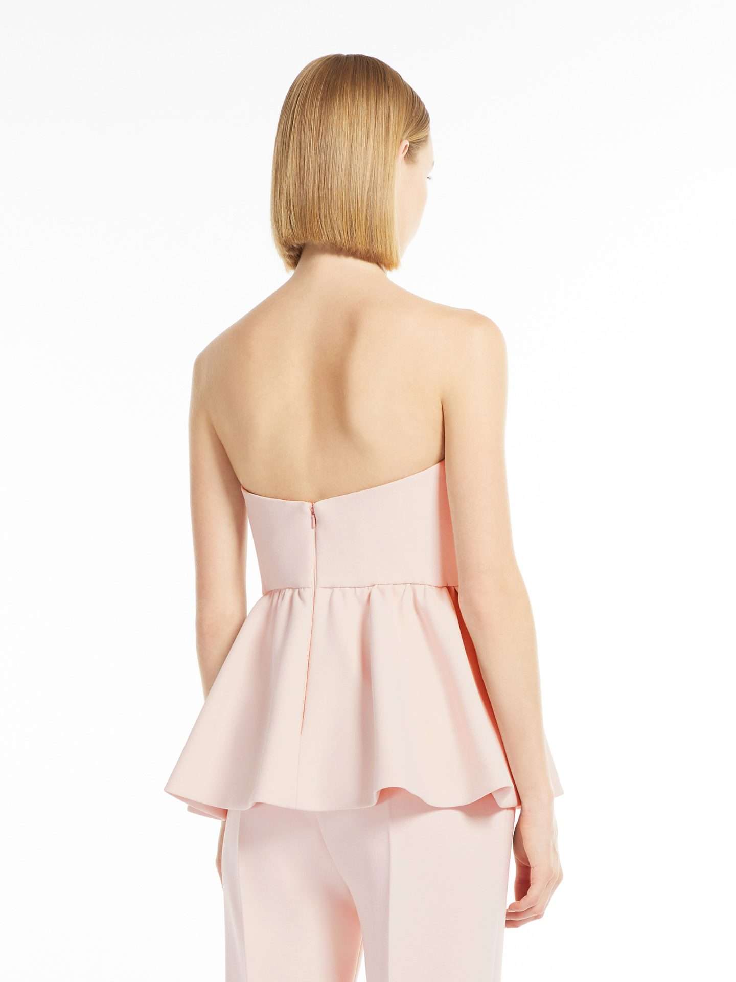 Top bustier in sablé accoppiato con taglio in vita. La silhouette è caratterizzata da corpetto a fascia con scollo dritto e motivo a balza sul fondo che dona volume. Modello foderato, rifinito con tasche inserite nei fianchi. Chiusura con lampo sul retro.