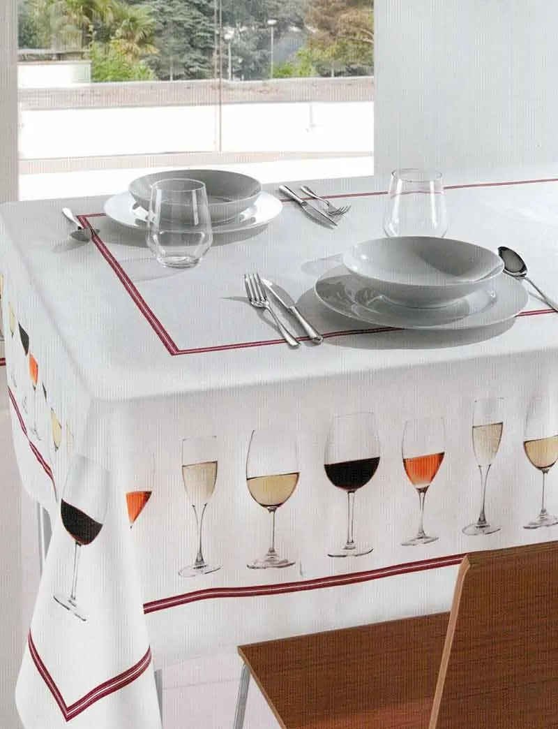 Tovaglia da Tavola Happy Hour con calici stampati su tessuto diย puro cotone, disponibile per 6-8-12 persone. Misure: 6 persone cm 150 x cm 180 8 persone cm 150 x cm 220 12 persone cm 150 x cm 270