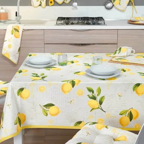 Tovaglia Vallesusa Amalfi disponibile da 4 e 6 posti stampata su panama di puro cotone. Ideata, tessuta, stampata interamente in Italia. Una bellissima fantasia limoni arricchisce la tovaglia e renderร la tua tavola un trionfo di colori e allegria. Misure: 4 posti cm 150 x cm 150, 6 posti cm 150 x cm 180.