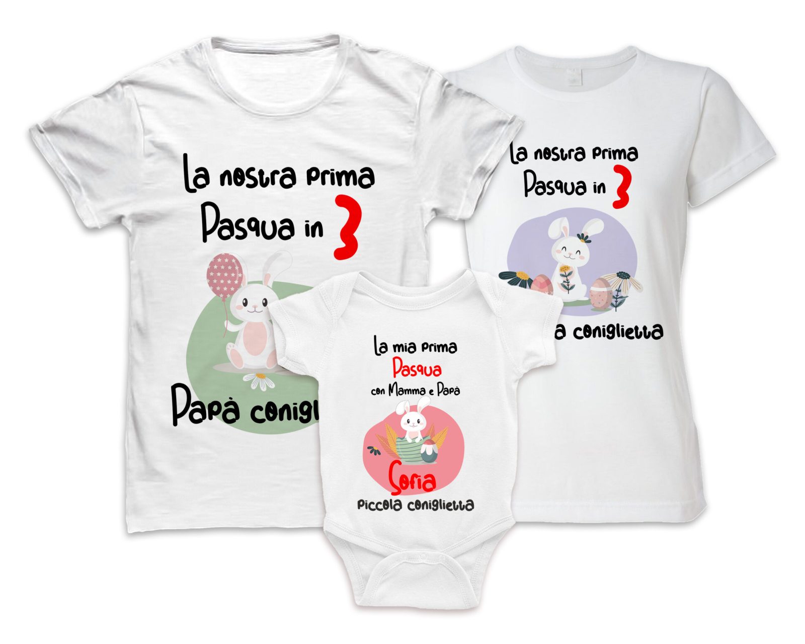 Tris Magliette e Body Neonata – Pasqua – Nome Personalizzabile – La nostra Prima Pasqua in 3 – Coniglietta – Cartoon – Femminuccia – Bimba