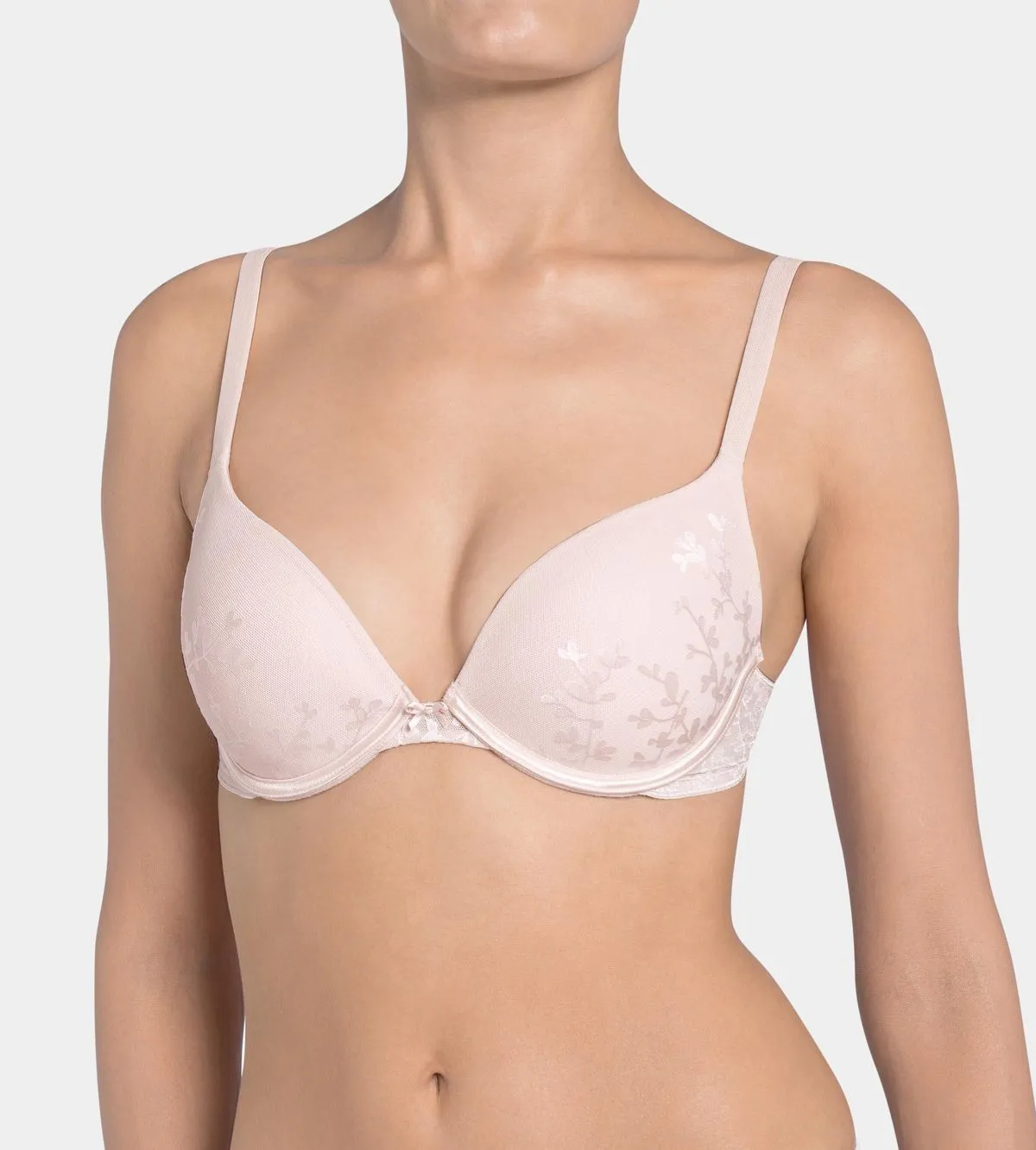 Reggiseno push up Triumph art. Body Make-Up Blossom WHUM variante rosa cipria disponibile in CUP B-C. Reggiseno con coppe imbottite con profonda scollatura ideale per donare volume al tuo décolleté. Bretelle regolabili e removibili indossabili anche ad incrocio. A rendere questo reggiseno iperfemminile è il delicato tulle con motivo floreale su coppe e sui laterali trasparenti per un look femminile e seducente. Chiusura a 2 ganci per un sostegno ottimale a tripla regolazione. Materiale Spacer Cup, tessuto morbido e traspirante. Marca: Triumph.