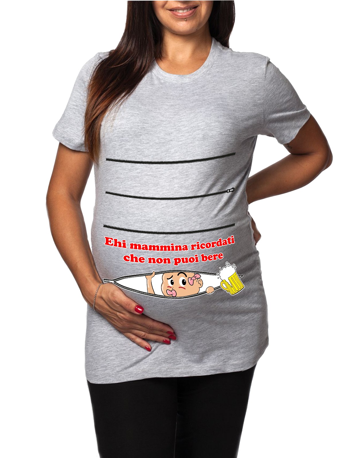 Tshirt Premaman Donna – Bimbo Zip – Ehi Mammina – Ricorda che non puoi bere – Tshirt Gravidanza Divertenti – Idee Regalo Futura Mamma