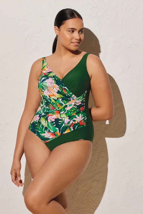 Ysabel Mora costume intero ccoppe B prteformate e leggermente imbottite adatte ad un sostegno ottimale del seno. La scollatura è a V per un maggior risalto del décolleté. Bretelle larghe ed elastiche ti assicurano comfort. Il tessuto, con drappeggi laterali a tema jungle su fondo verde foresta, è in lycra sensitive effetto seta e delicato sulla pelle. All’interno del costume, la retina permette di modellare ed appiattire la pancia snellendo e slanciando la silhouette. Semplice ed elegante, con questo costume sarai sempre chic e alla moda.