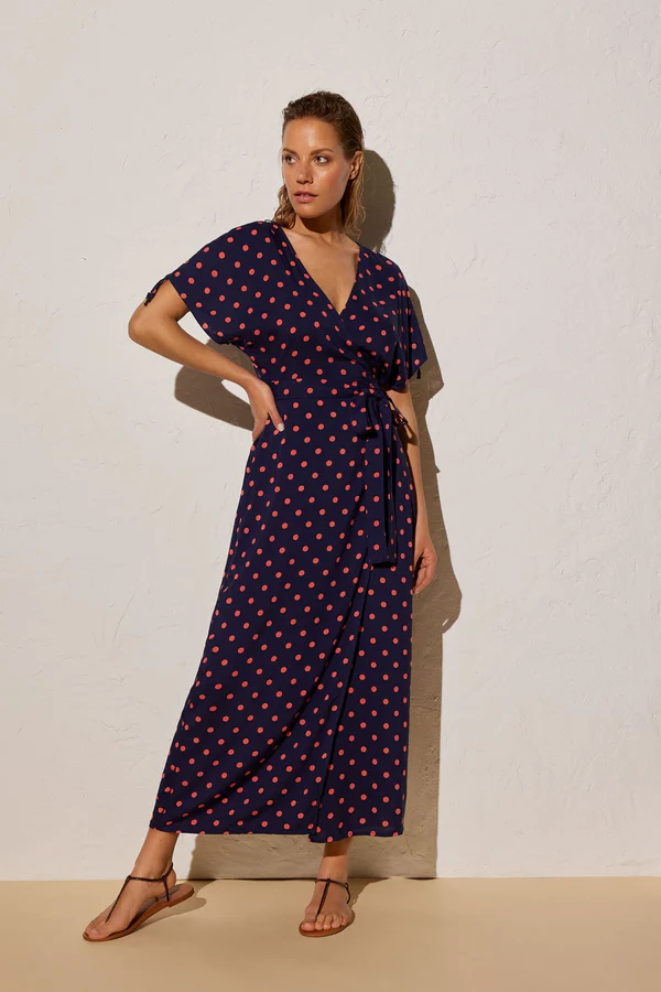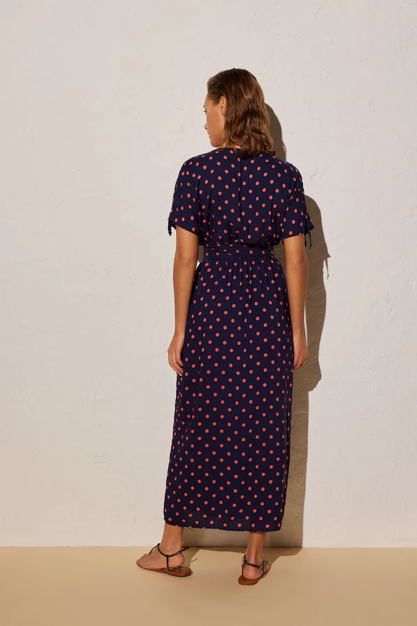 Ysabel Mora vestito estivo lungo a portafoglio di colore blu a pois coral. Scollatura a V e bretelle che si possono regolare in larghezza tramite le coulisse sulle spalle. La chiusura a fiocco permette di adattare il vestito secondo la vostra corporatura e quindi essere indossato da chiunque. Composizione: 100% Viscosa